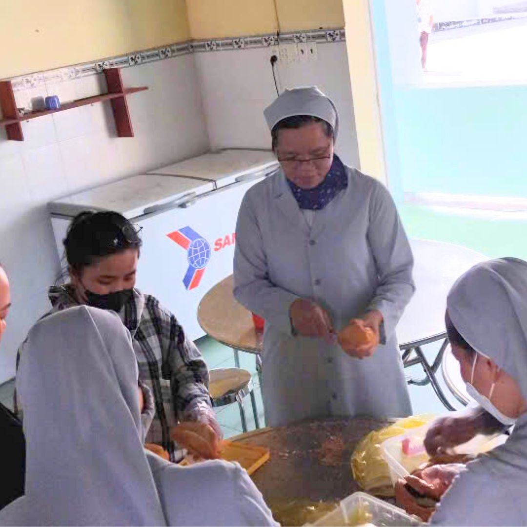 Sáng nay, mọi người tất bật chuẩn bị: bánh mì, thịt, chả, dưa leo cắt sẵn, kèm tương ớt, xì dầu… đủ thứ. Xong xuôi đâu đó thì cũng đến giờ chính thức “vào việc”. Vì lý do an toàn trong khâu chế biến và đóng gói, trung tâm yêu cầu đoàn lên tận nơi làm cùng nhân viên ở trại. Thế là đúng 14 giờ chiều, bốn Soeurs cùng các cộng tác viên có mặt tại trung tâm chăm sóc người tâm thần.