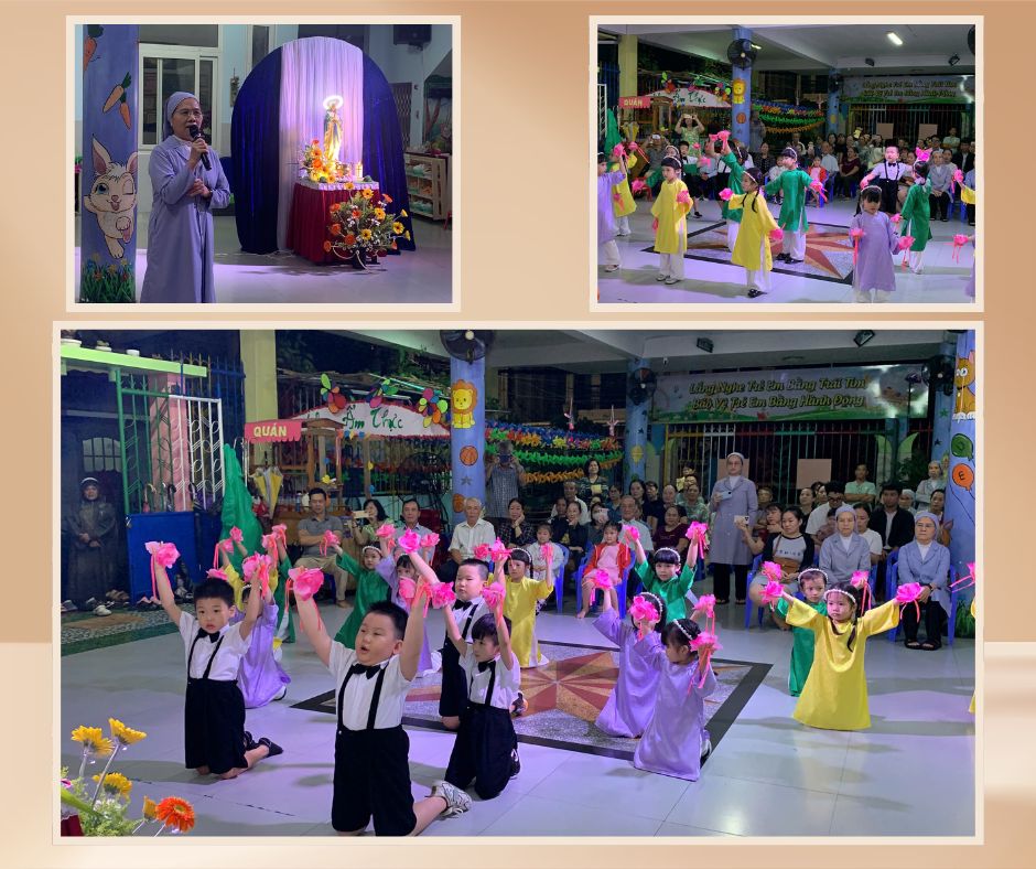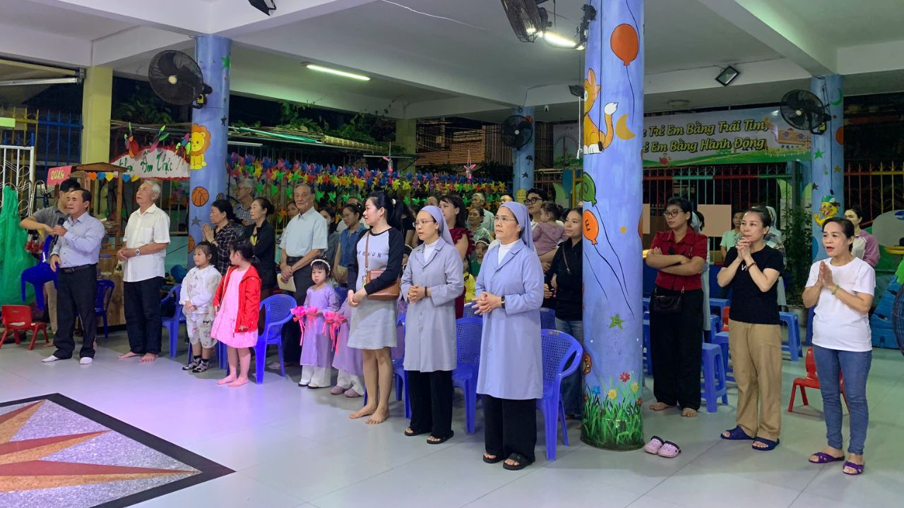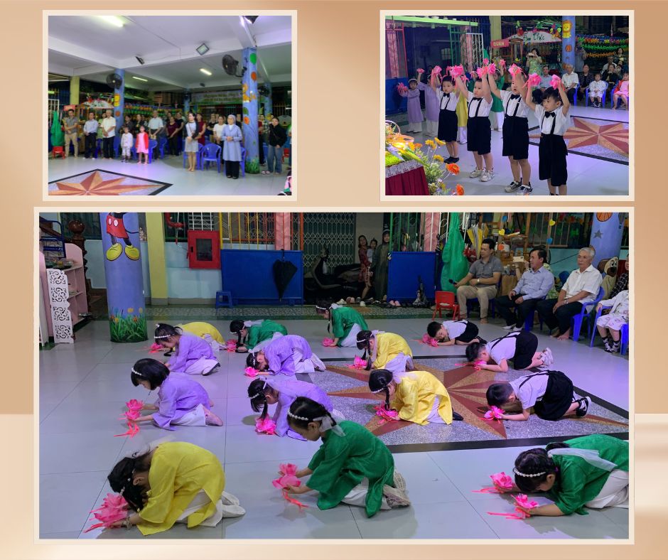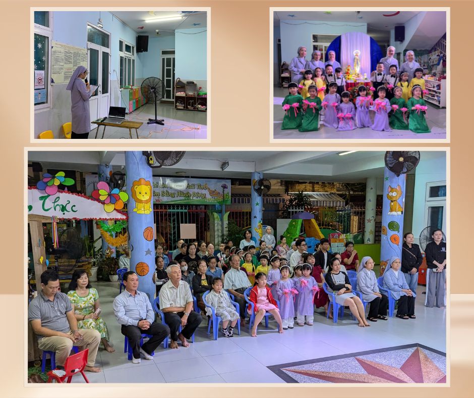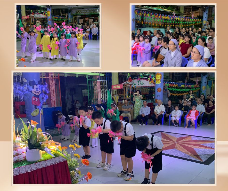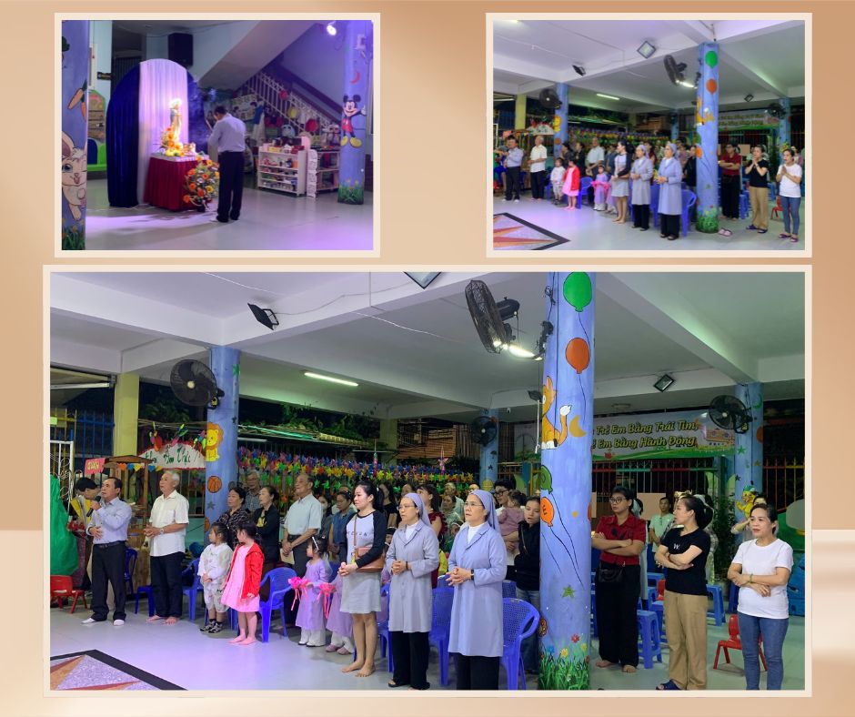 Giờ kinh mở đầu thật cảm động với điệu vũ đơn sơ, trong sáng của các em nhỏ trường Mầm non Vàng Anh, như những đoá hoa tinh khôi dâng lên Mẹ. Mỗi động tác, mỗi bước chân, mỗi ánh mắt ngây thơ của các em hướng về Mẹ Maria đều trở thành lời ca tạ ơn và tôn vinh, thay lời cộng đoàn bày tỏ tình yêu tha thiết dành cho Mẹ.
