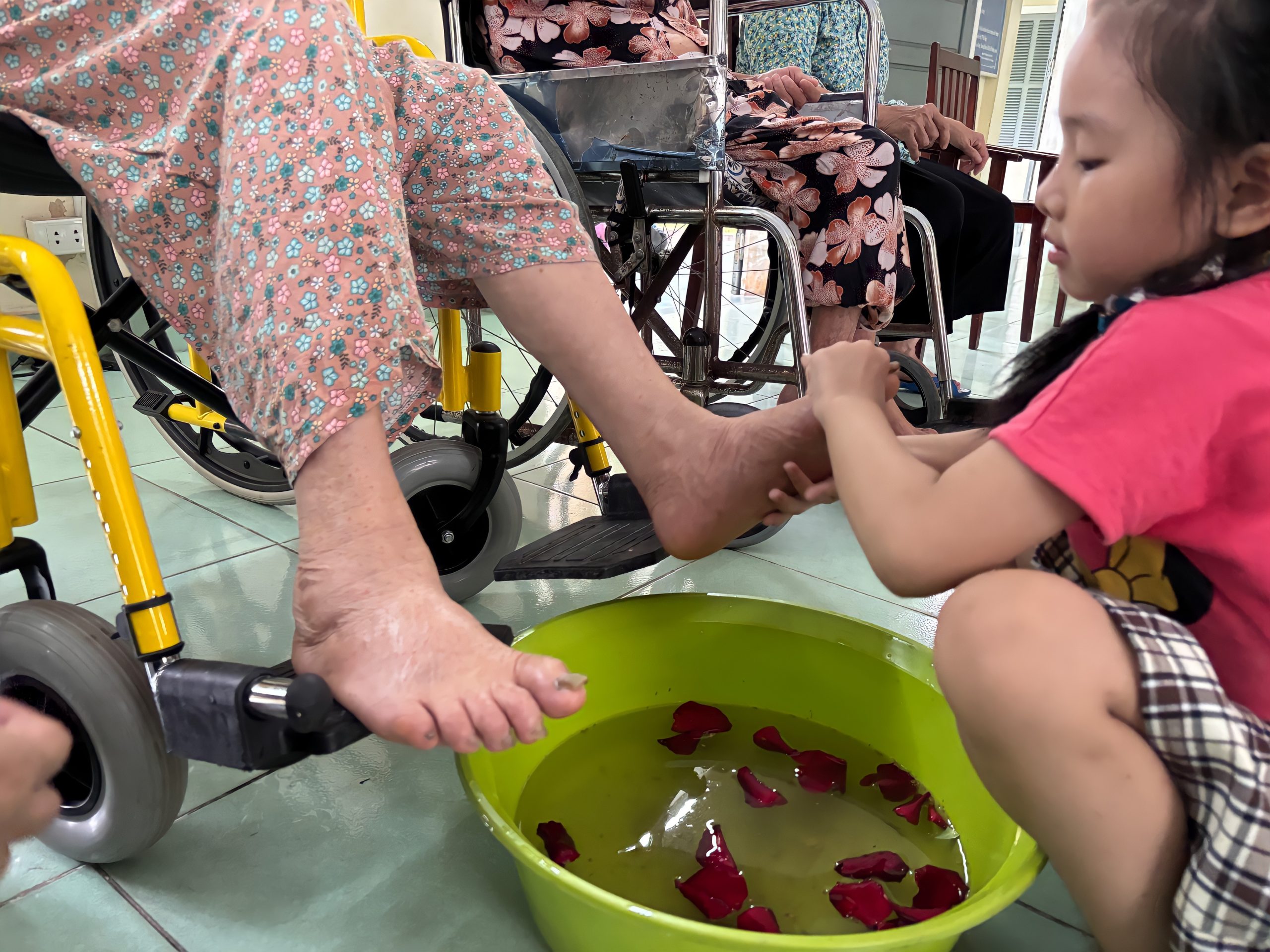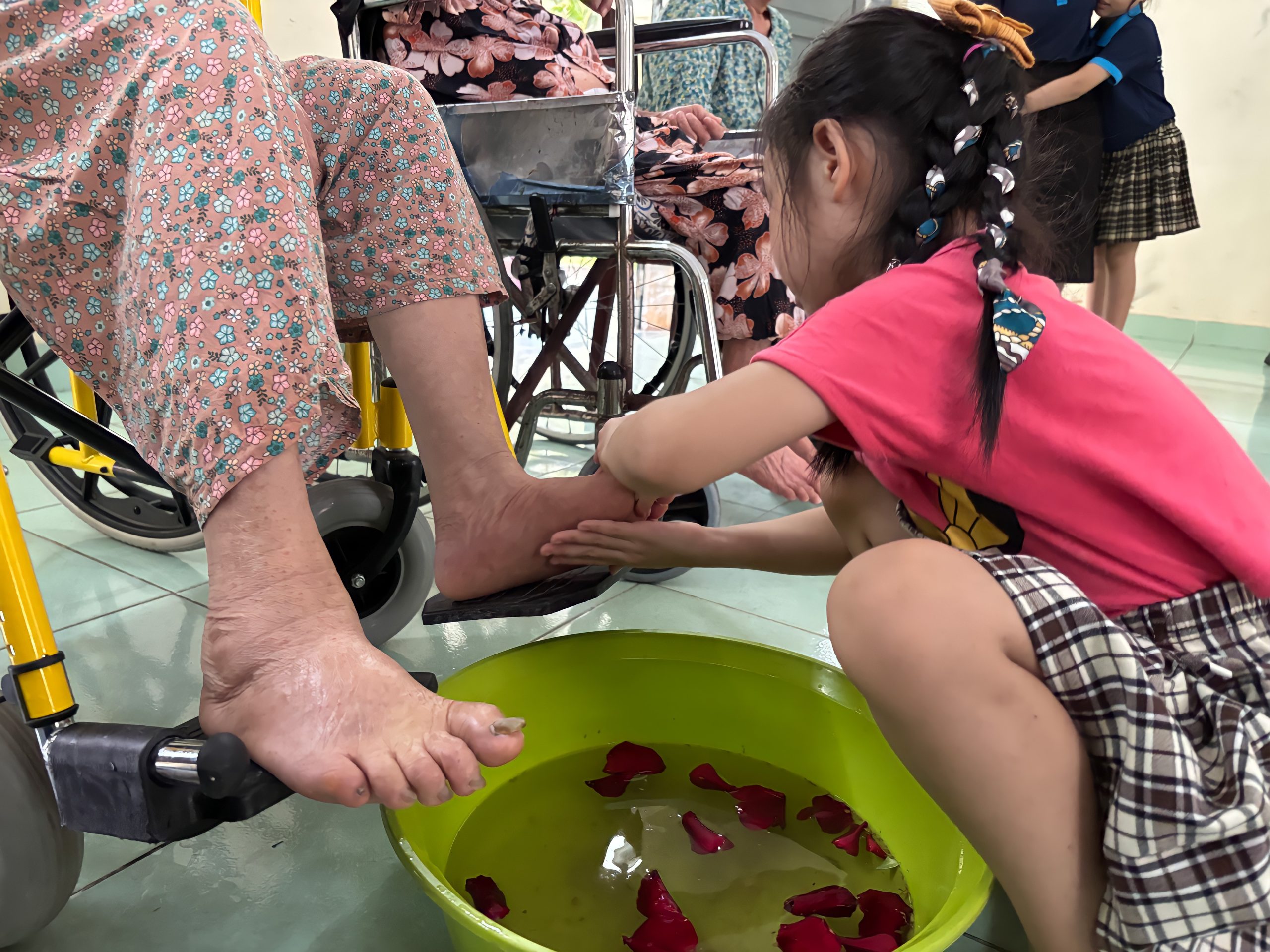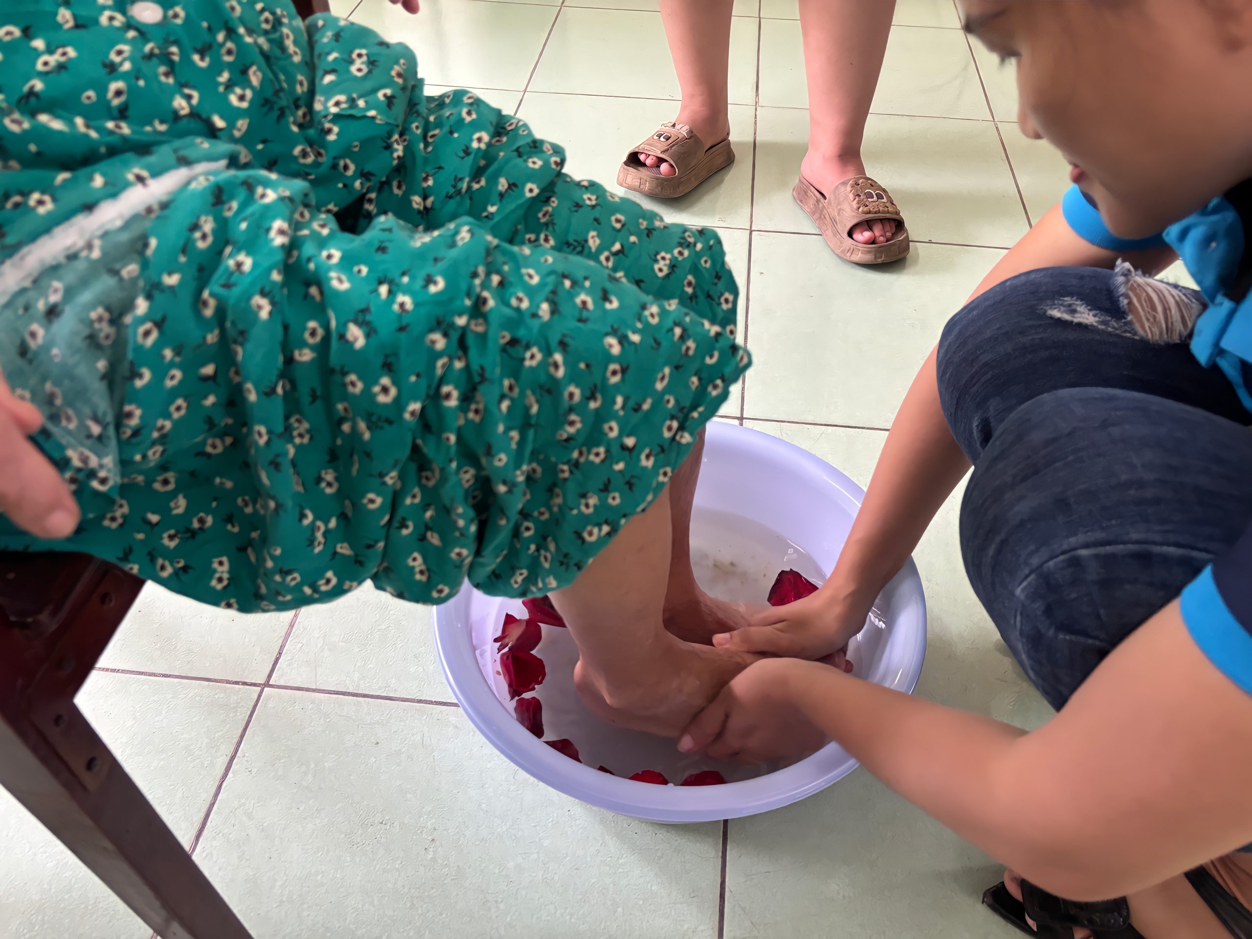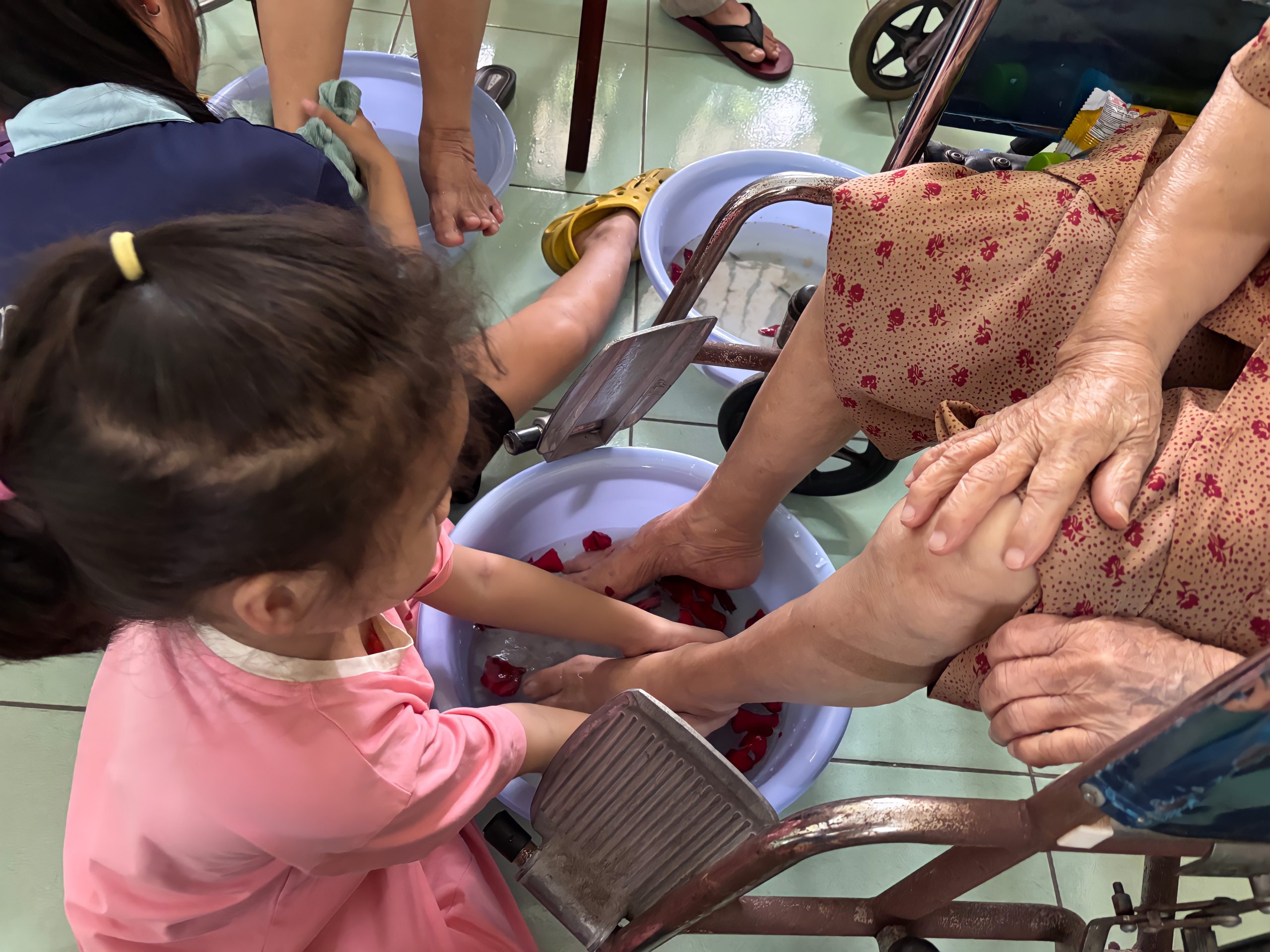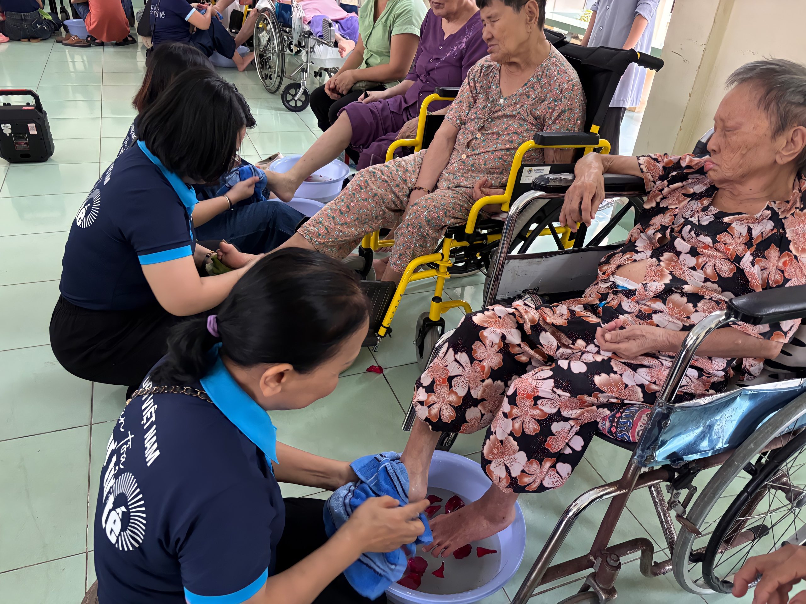 Không ồn ào, không phô trương, các bạn trẻ âm thầm cúi xuống, nhẹ nhàng rửa và xoa dịu đôi chân già cỗi, những bàn chân đã in hằn dấu vết thời gian và cuộc đời. Trong từng cử chỉ chăm chút ấy, người ta không chỉ thấy nước ấm, mà còn cảm nhận được một tình yêu chân thành và sự hiện diện của lòng thương xót.