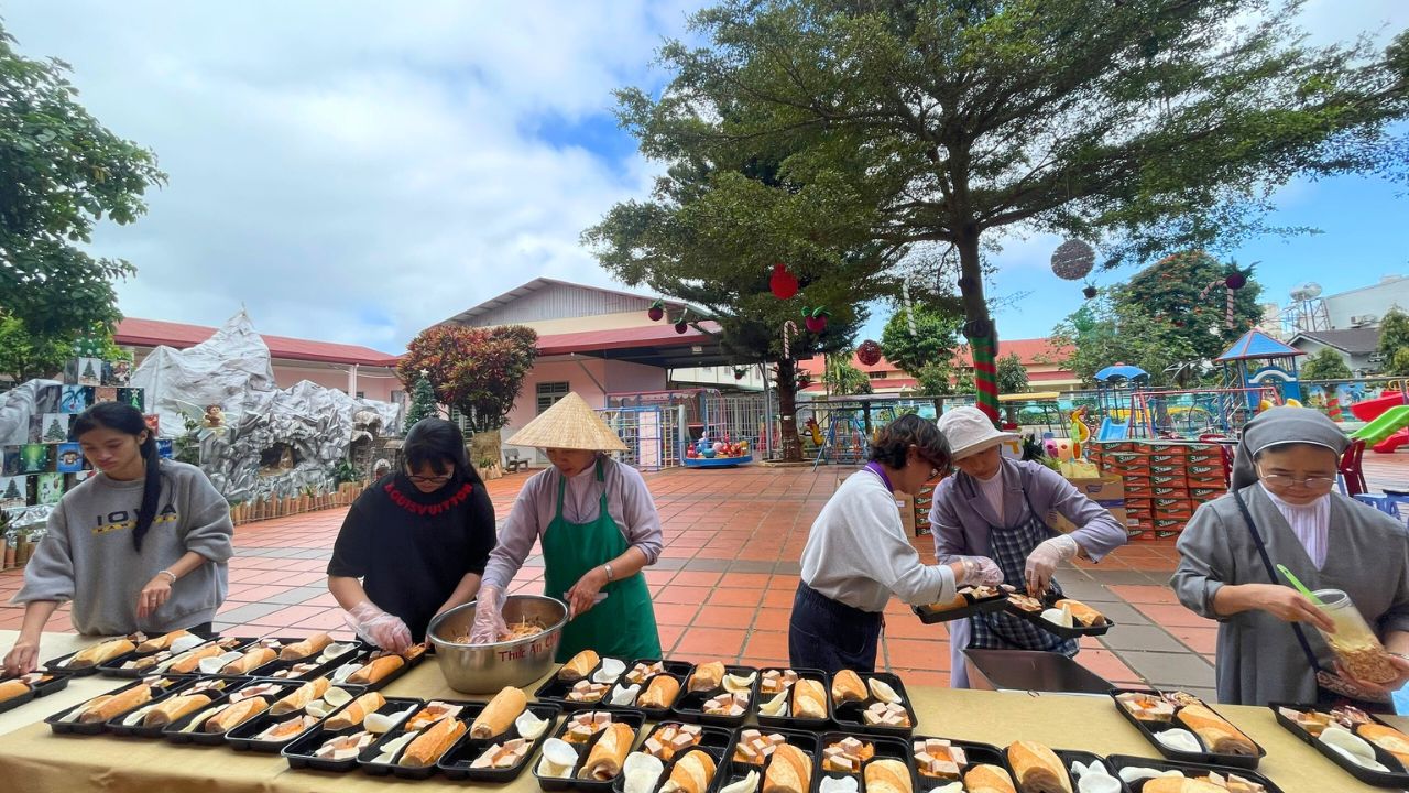 Với mong muốn gửi trao yêu thương, trong gian bếp nhỏ đầy ắp tiếng cười và tình thương, chúng tôi đã tất bật không chỉ từ sớm tinh sương nhưng là từ những ngày mùa vọng trước đó qua những bữa cơm đơn sơ, đạm bạc, những hy sinh nhỏ bé, lời cầu nguyện âm thầm cùng tấm lòng quảng đại nhiệt tâm của những người đã đồng hành với chúng tôi, tổ chức một bữa cơm thật ấm áp và chan chứa tình thương. Từng củ khoai, bó rau được lựa chọn kỹ càng; từng miếng thịt, chén soup được nêm nếm bằng tất cả sự tận tâm; từng món quà được chuẩn bị và gói gém cách cẩn thận. Chúng tôi không chỉ nấu để người nghèo được “no bụng”, mà còn được “no lòng”. Ngoài những món ăn bổ dưỡng thể chất, chúng tôi còn đem đến món ăn tinh thần qua những tiết mục văn nghệ dễ thương của các em nội trú trong cộng đoàn. Em nhỏ làm việc nhỏ, chị lớn phụ giúp quý Soeurs sửa soạn và phục vụ bàn ăn. Mỗi suất ăn là một lời cầu nguyện, mỗi món quà là sự trân trọng dành cho những số phận kém may mắn, gửi gắm tất cả tấm lòng của mỗi thành viên trong cộng đoàn.
