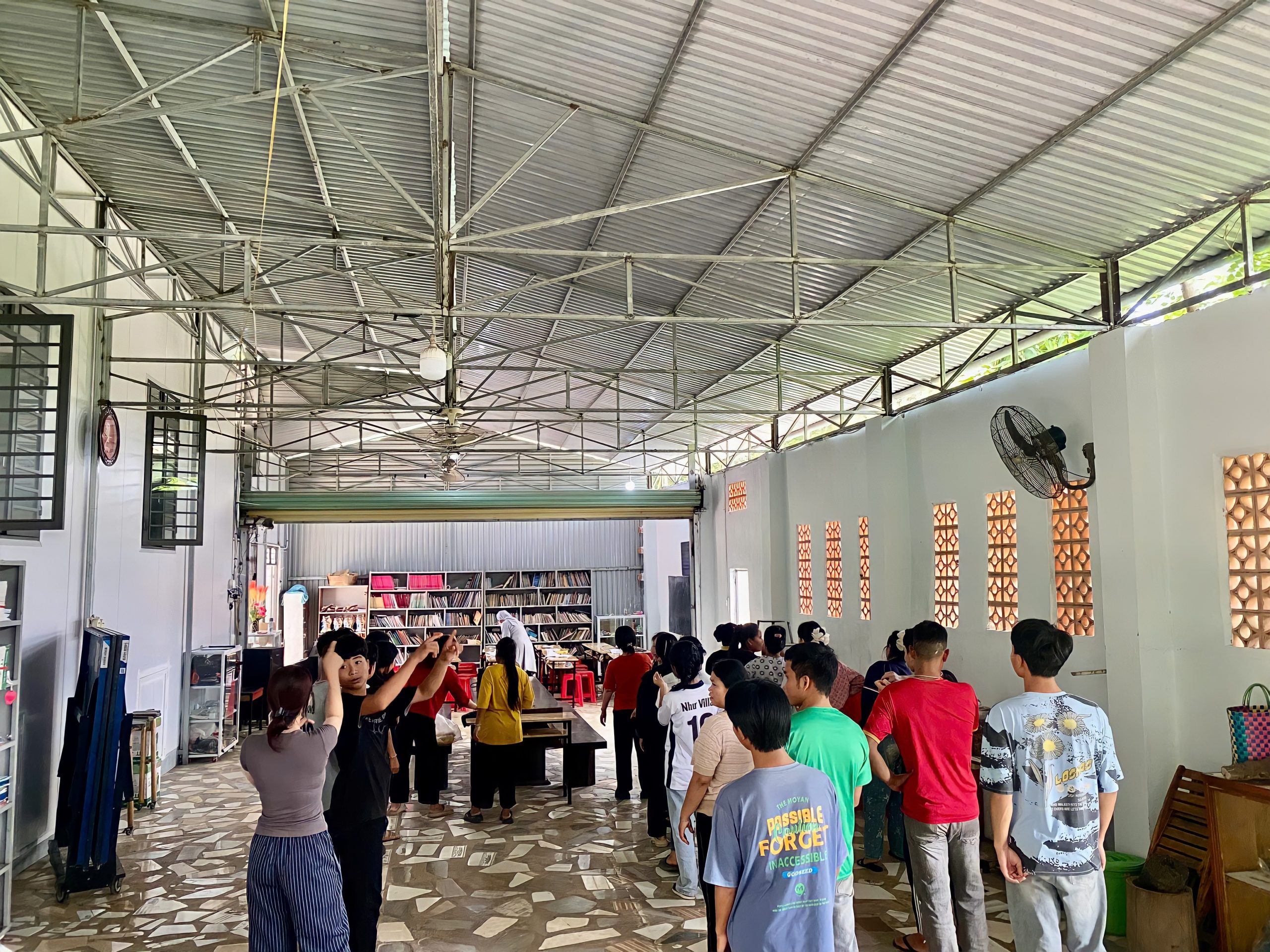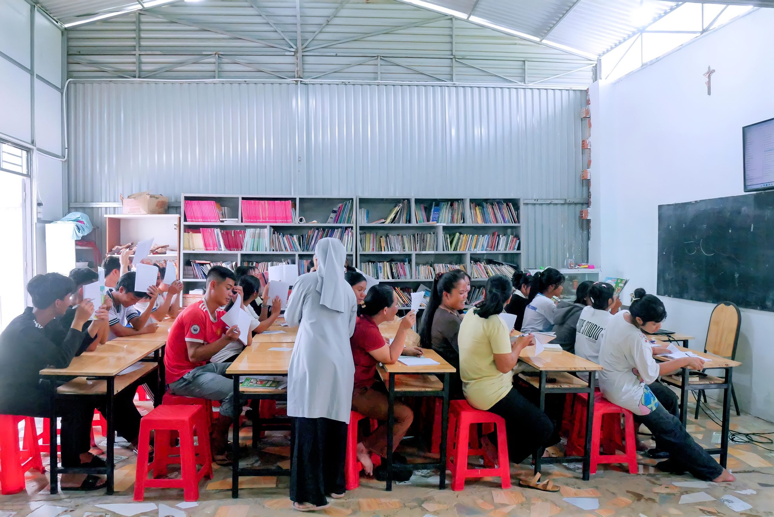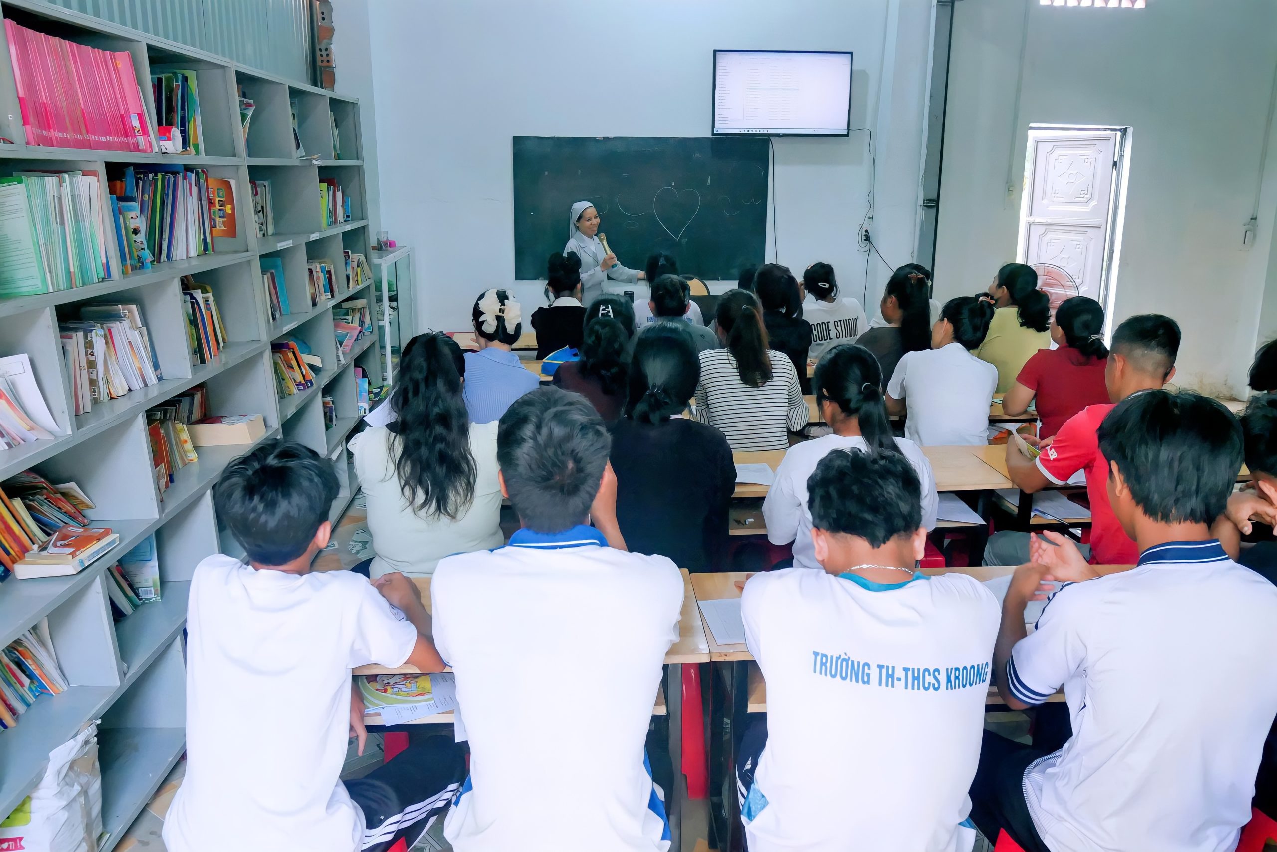 Cũng dịp này, Cha Phaolô Ali Khâm, Linh mục phụ trách Giáo xứ Kroong (với 2.572 giáo dân là anh chị em dân tộc thiểu số) cũng xin quý Soeurs ghé thăm và huấn luyện cho các giáo lý viên tại buôn làng vào mỗi buổi sáng, từ 8h30’ đến 11h15’. Buổi chiều, quý Soeurs trở về Giáo xứ Phương Nghĩa, lớp học tiếp tục từ 17h30’ đến 21h15’.