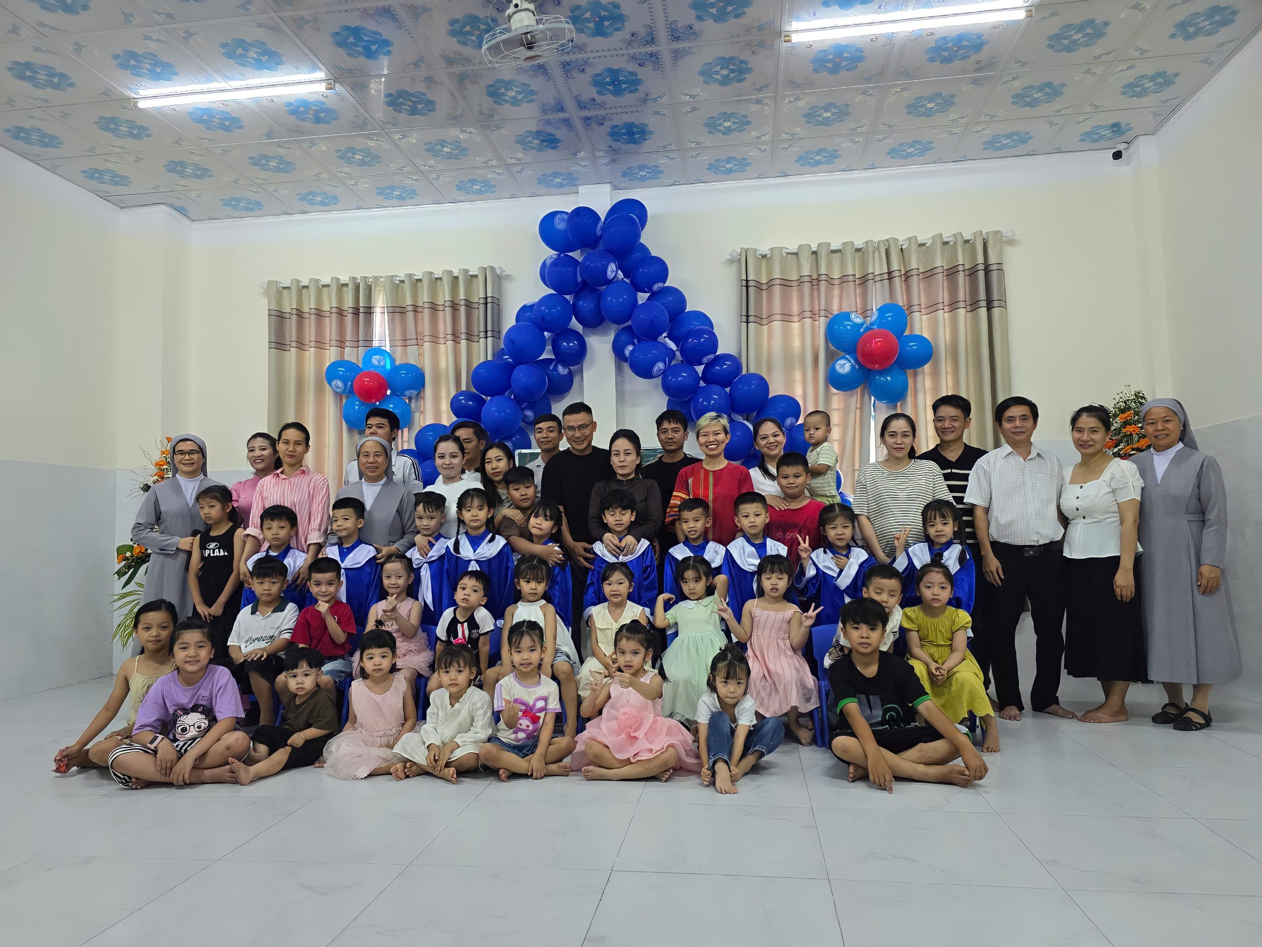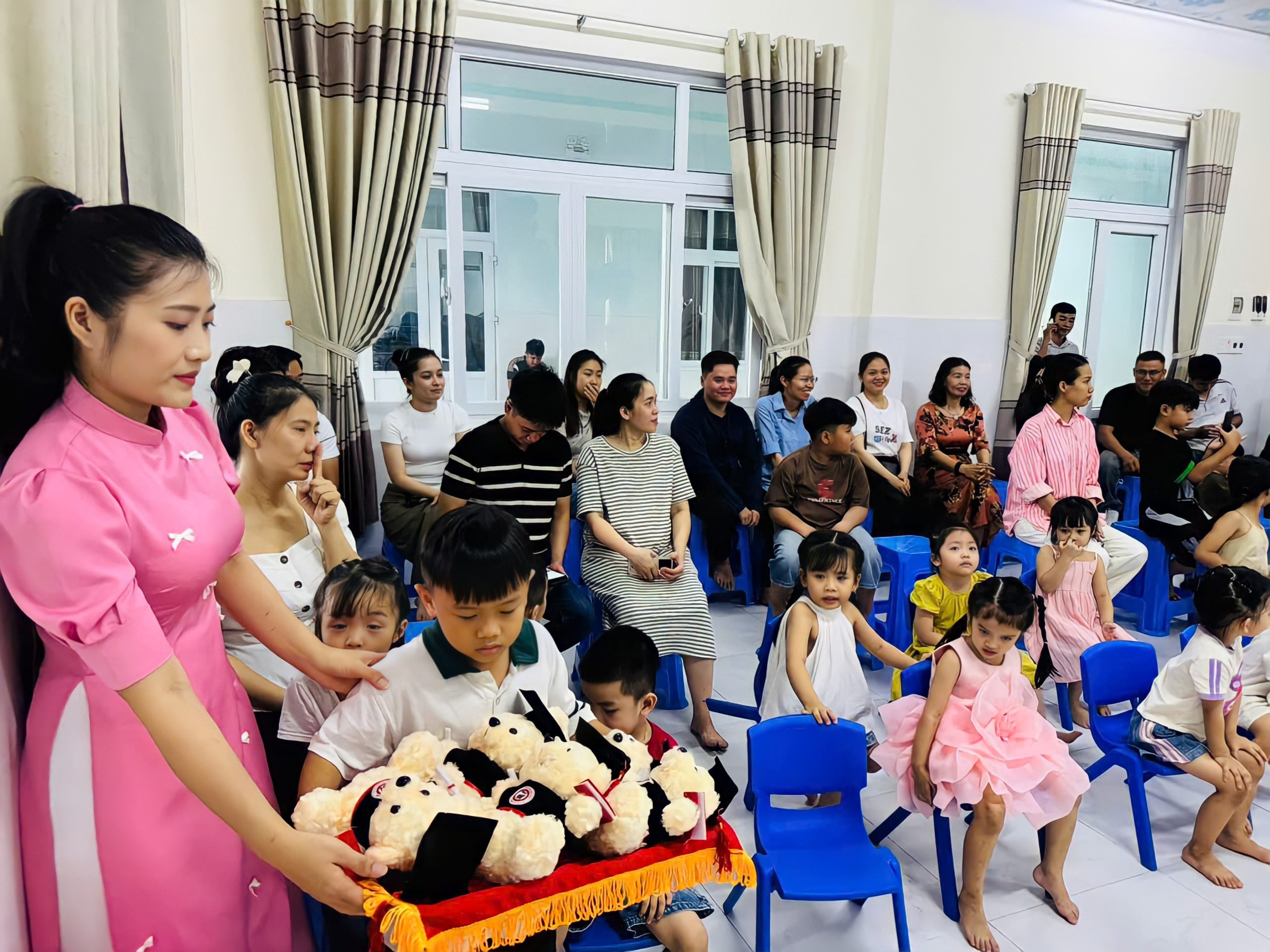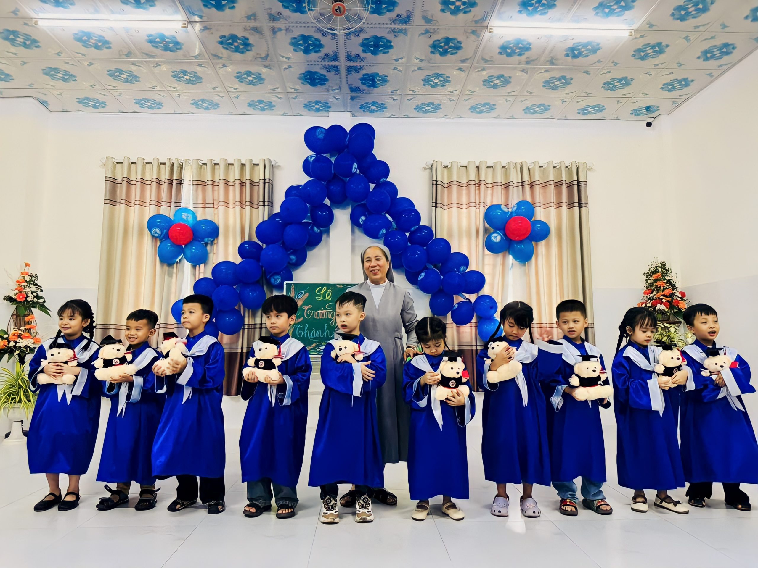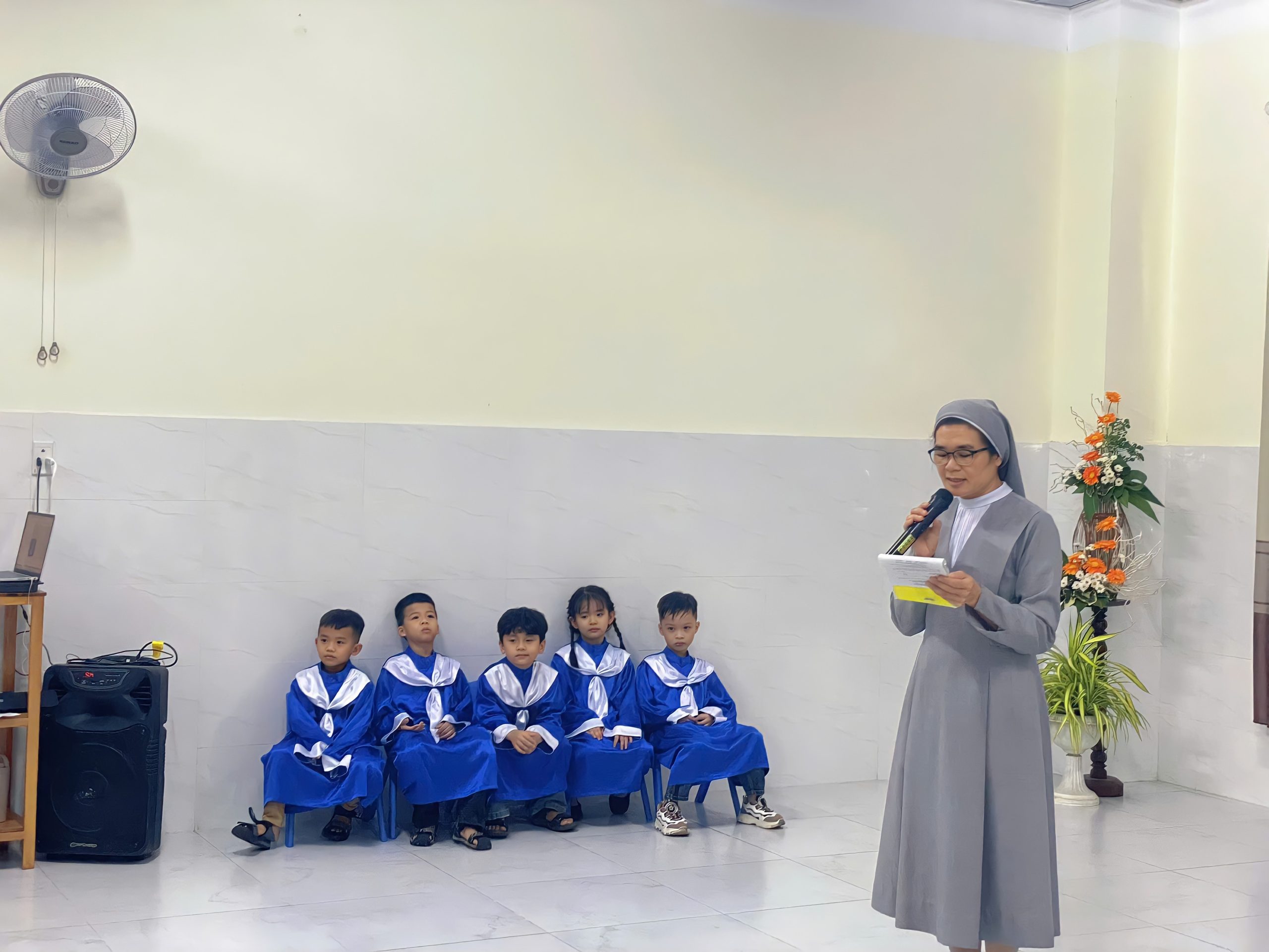 Buổi lễ diễn ra trong không gian đơn giản nhưng ấm cúng, với sự hiện diện của Ban giám hiệu nhà trường, quý Soeurs, quý cô, các em nhỏ trong lớp, và đặc biệt là quý Ba Mẹ, Ông Bà, anh chị em của 10 “Tân cử nhân nhí”.