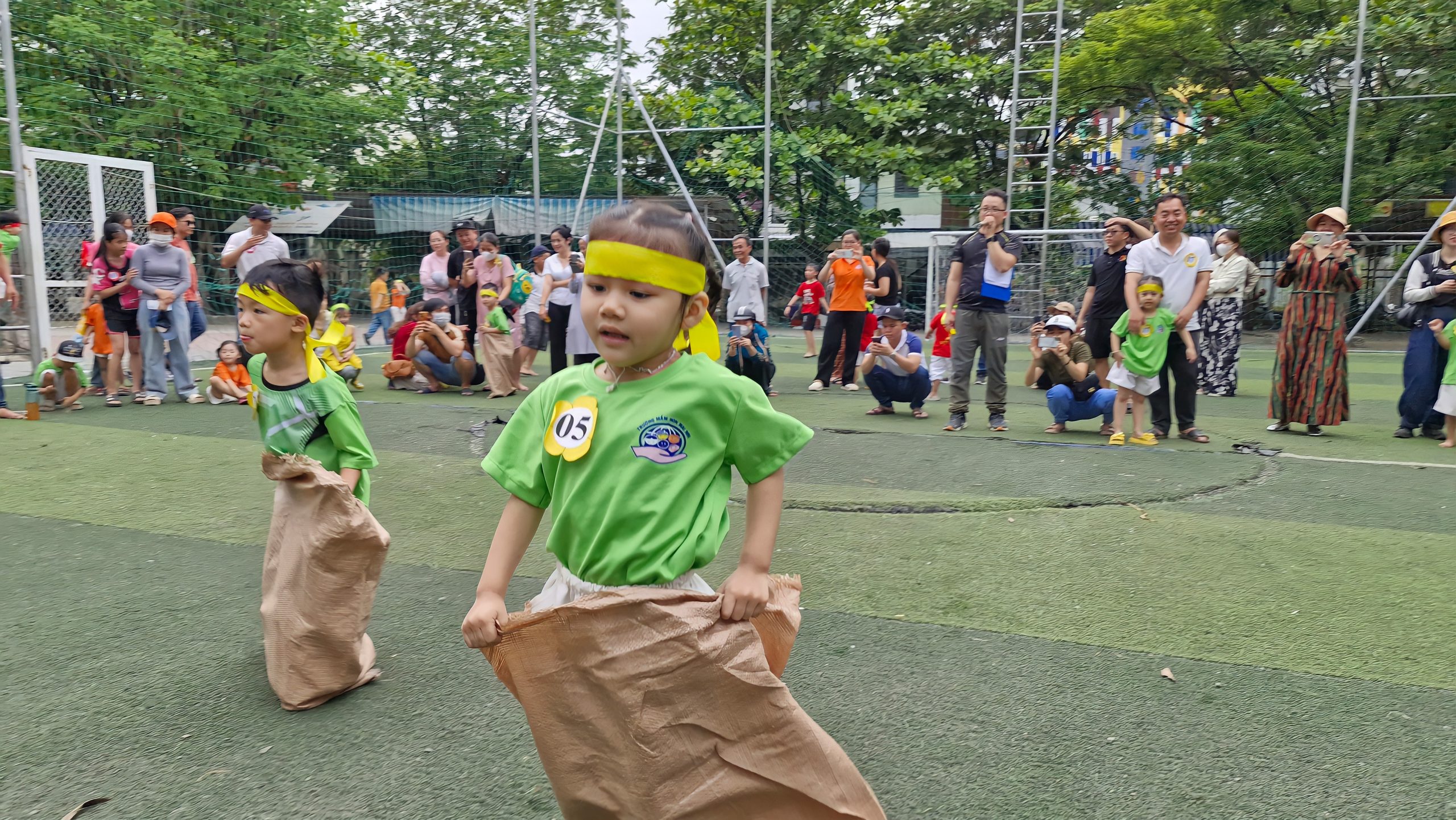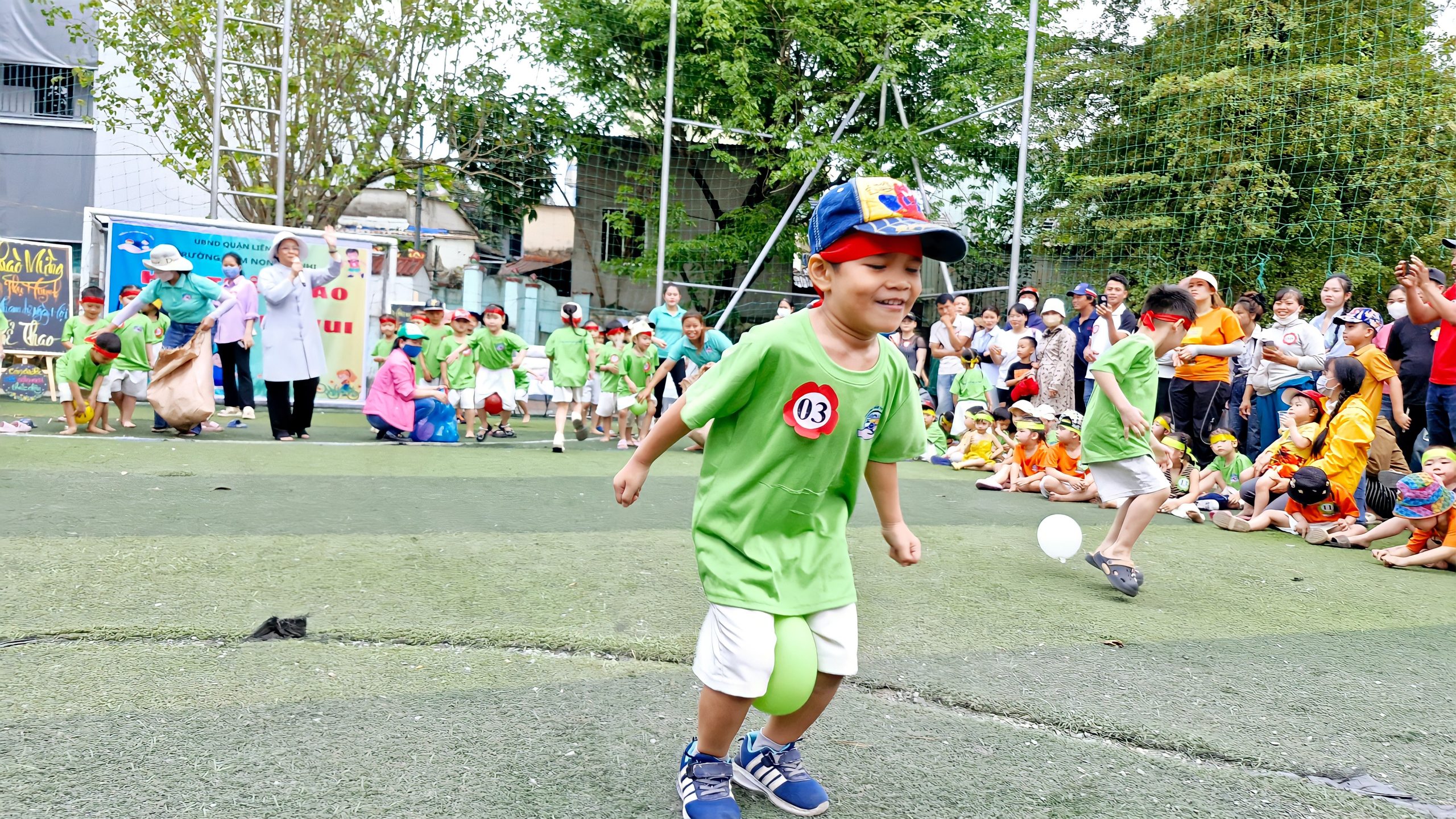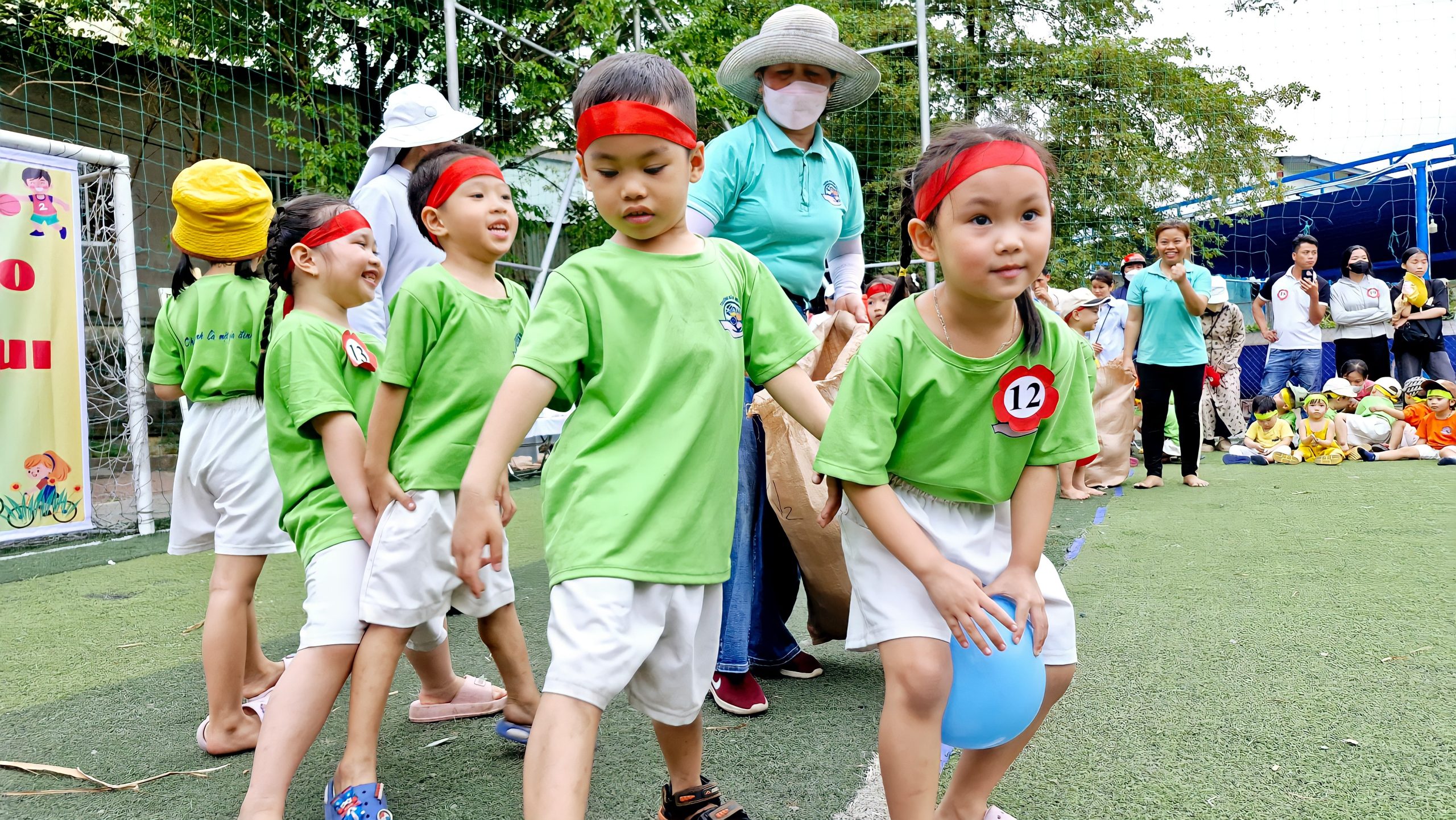 Lễ hội bắt đầu bằng màn diễu hành đầy sắc màu của các lớp. Các “vận động viên nhí” từ lớp Lớn, Nhỡ, Bé lần lượt tiến vào sân với khí thế hào hứng, mang theo những thông điệp đầy ý nghĩa như “Không có gì là không thể”, “Vươn tới đỉnh cao” hay “Yêu thương, chia sẻ vì tình bạn”. Sự tự tin, năng động cùng niềm vui và sự sẵn sàng của các bé đã mang đến bầu không khí đầy hứng khởi.