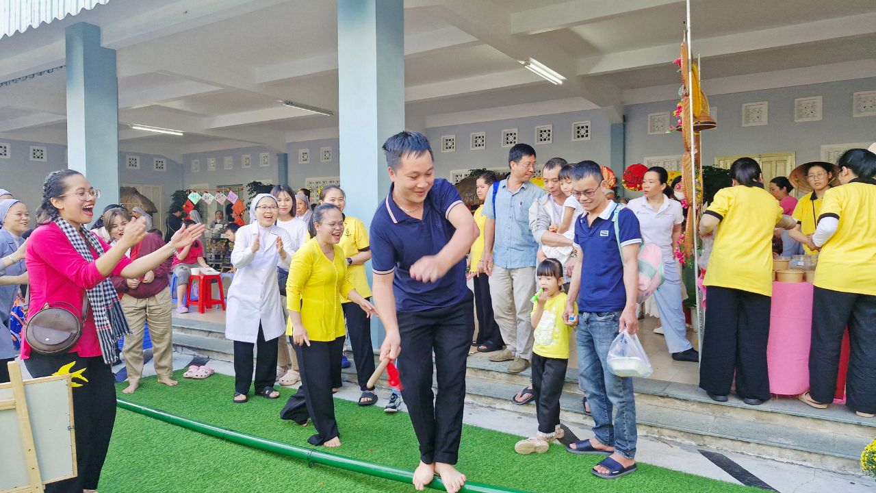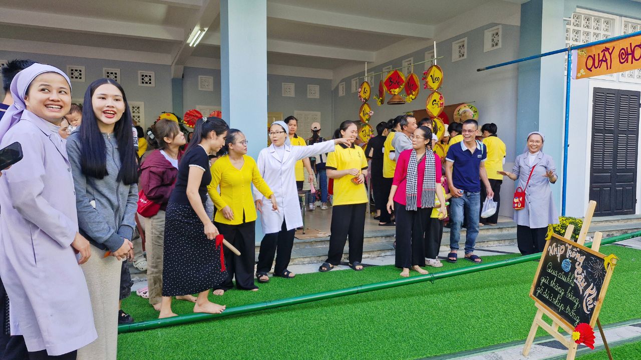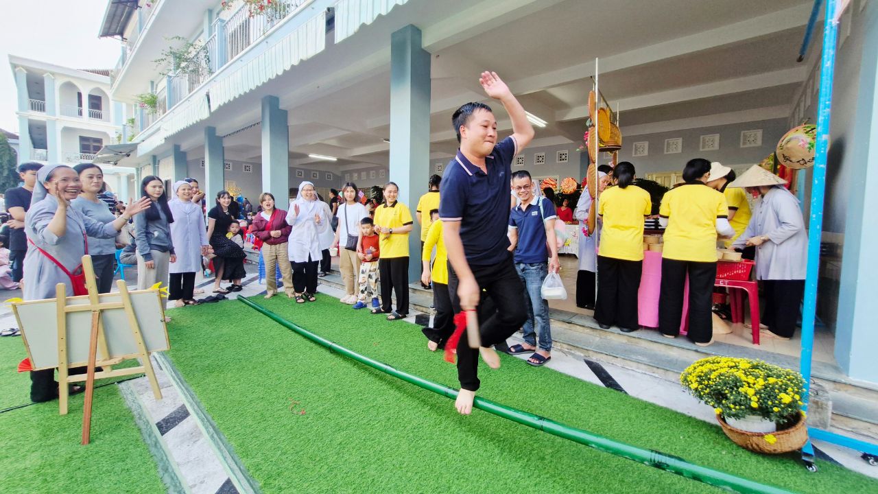 Sau khai mạc, không gian hội chợ trở nên náo nhiệt hơn bao giờ hết. Các Sơ, phụ huynh cùng các bé hào hứng hòa mình vào các trò chơi dân gian vui nhộn và ghé thăm những gian hàng rực rỡ sắc màu. Mùi thơm nồng nàn từ những món ăn truyền thống dân dã không chỉ làm hài lòng thực khách mà còn mang đến một hương vị Tết quê ấm áp, thắt chặt thêm tình thân ái giữa mọi người.