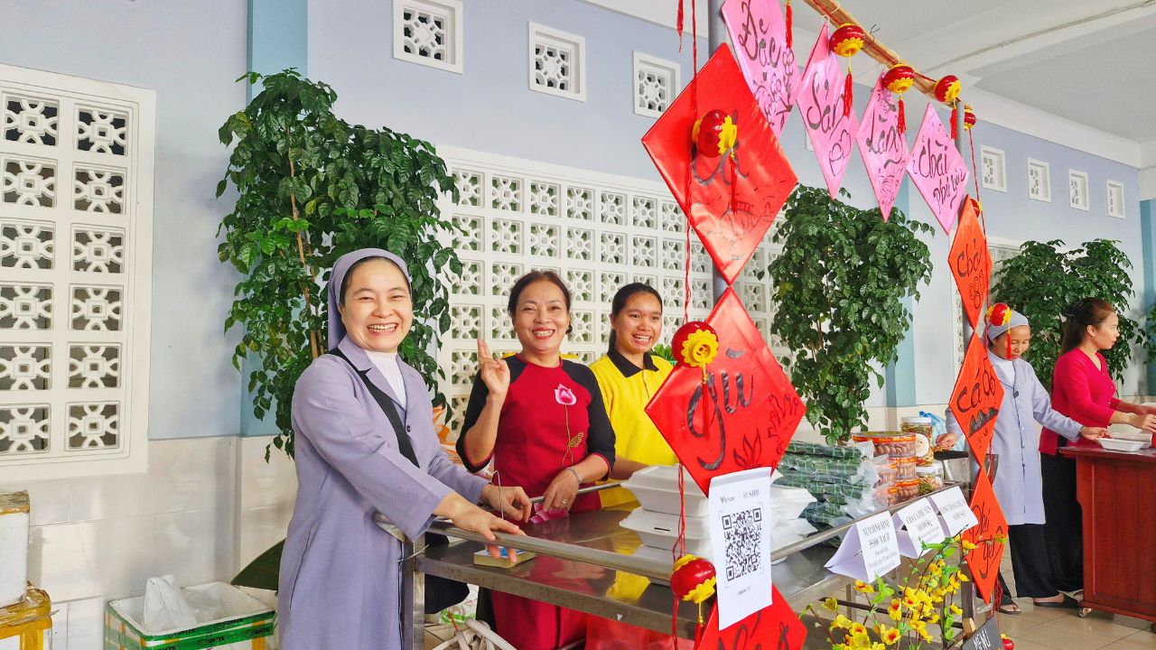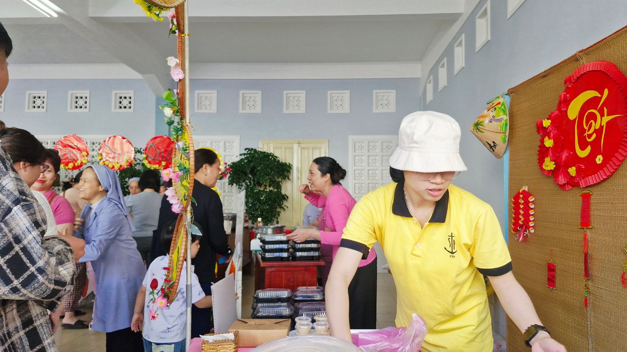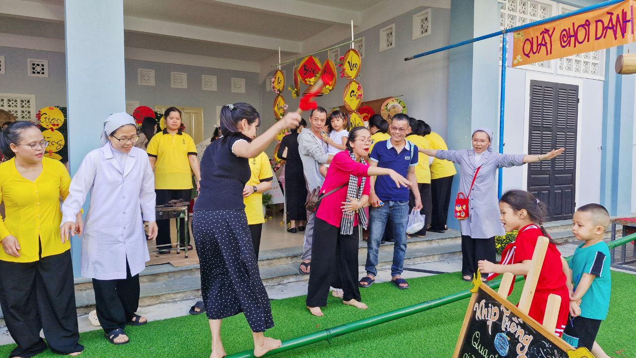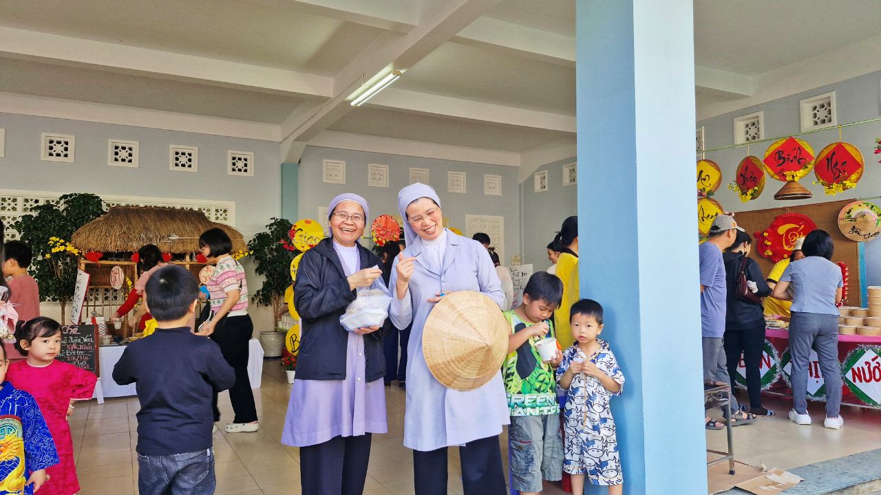 Sau khai mạc, không gian hội chợ trở nên náo nhiệt hơn bao giờ hết. Các Sơ, phụ huynh cùng các bé hào hứng hòa mình vào các trò chơi dân gian vui nhộn và ghé thăm những gian hàng rực rỡ sắc màu. Mùi thơm nồng nàn từ những món ăn truyền thống dân dã không chỉ làm hài lòng thực khách mà còn mang đến một hương vị Tết quê ấm áp, thắt chặt thêm tình thân ái giữa mọi người.