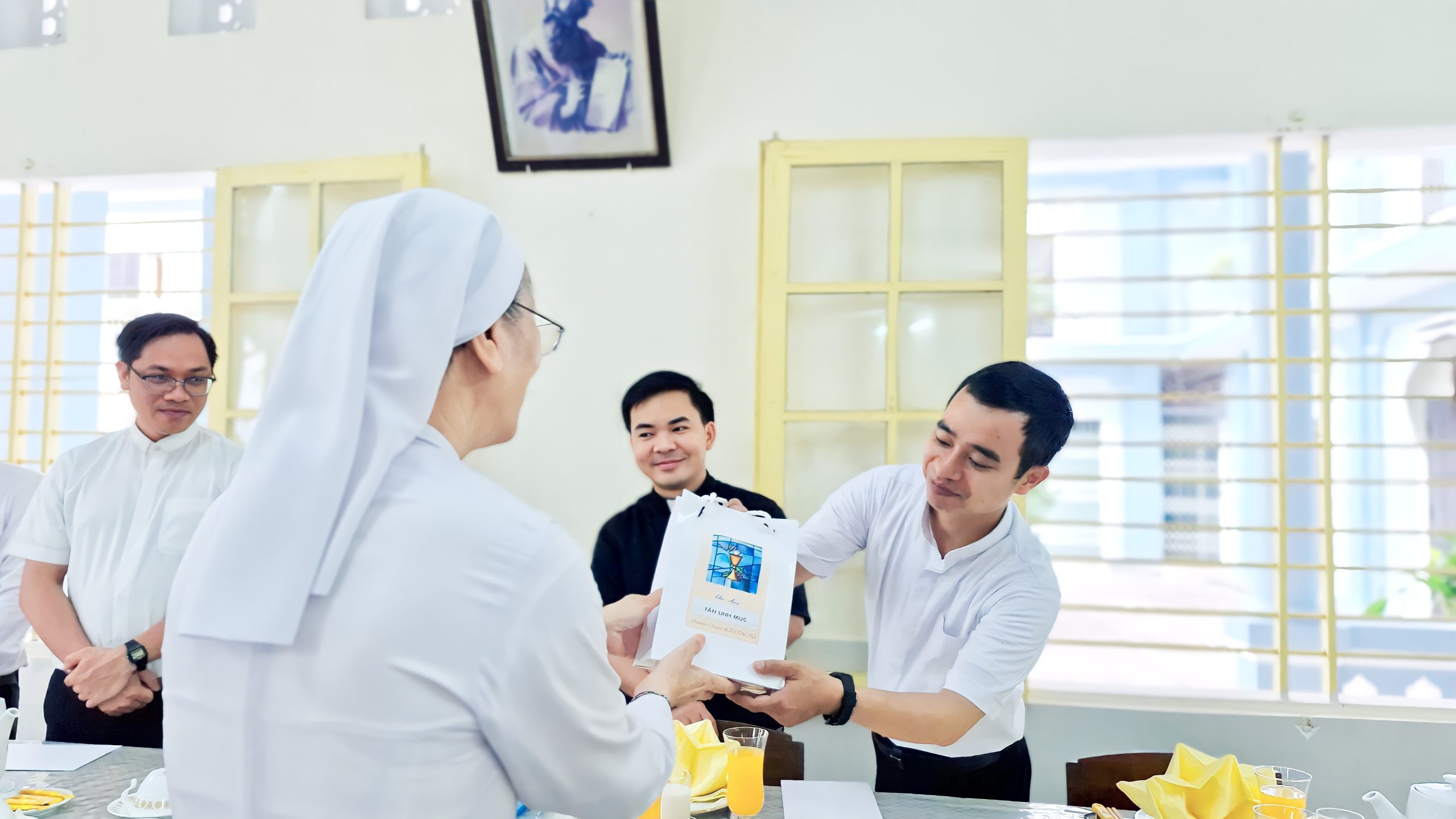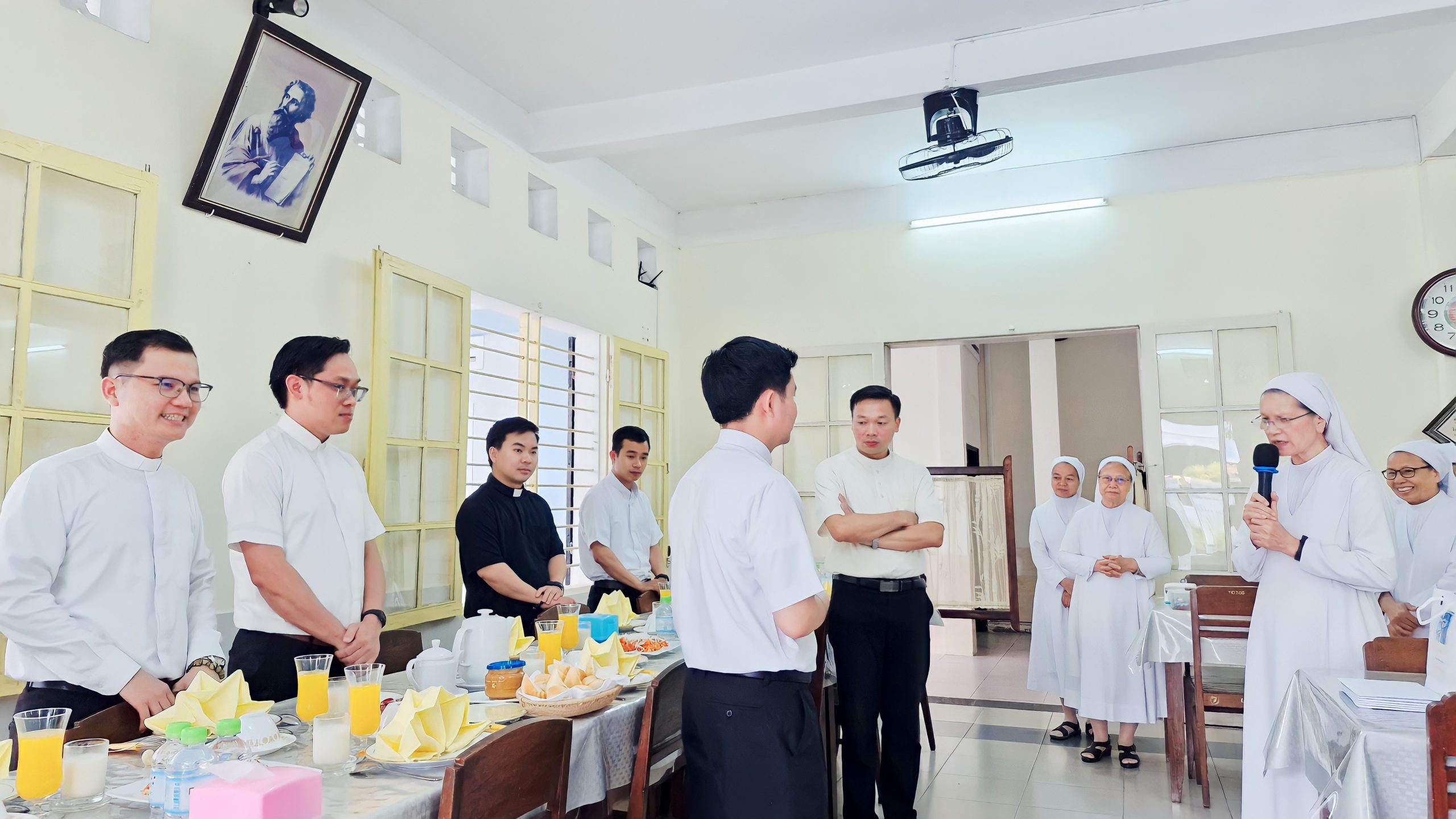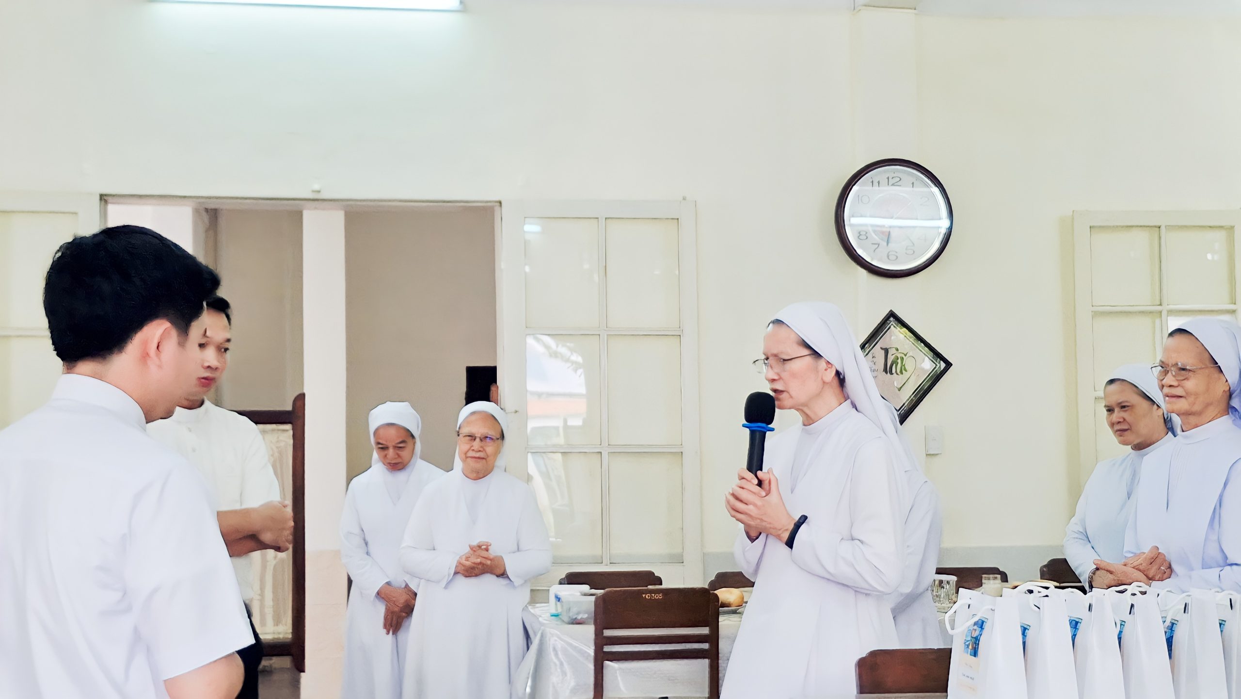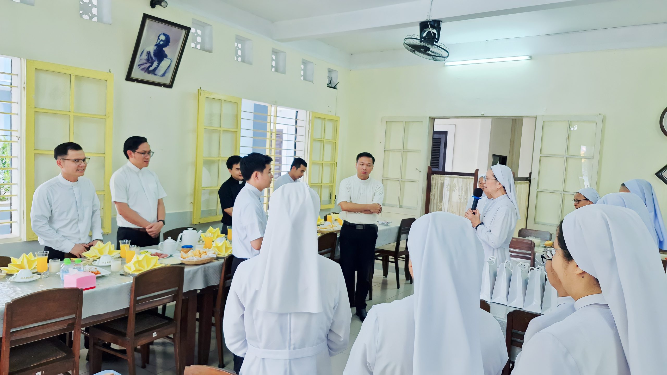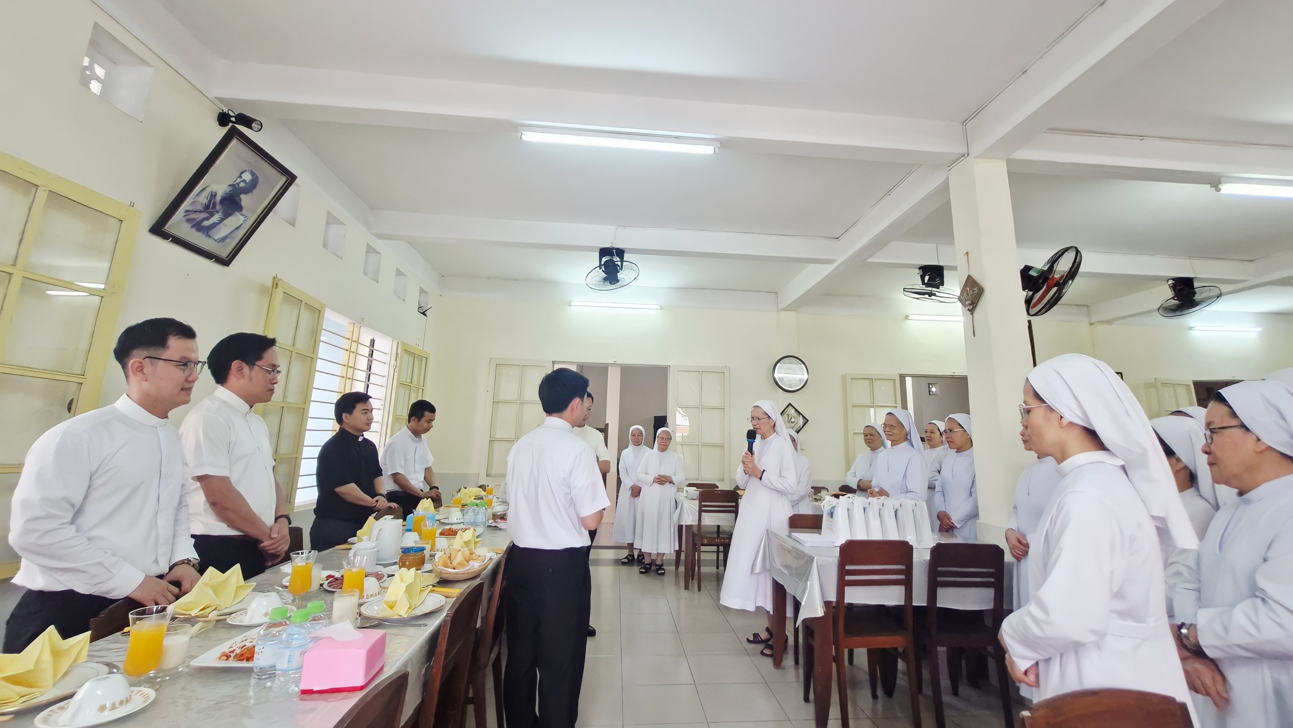 Sau Thánh Lễ, Soeur Bề Trên Giám Tỉnh đã đại diện cộng đoàn gửi lời chúc mừng thân tình đến quý Tân Linh Mục. Niềm vui được tiếp nối trong bữa cơm huynh đệ, nơi mọi người cùng chia sẻ tình hiệp thông, tình thân ái và những lời cầu chúc tốt đẹp cho sứ vụ tương lai của các Tân Linh Mục.