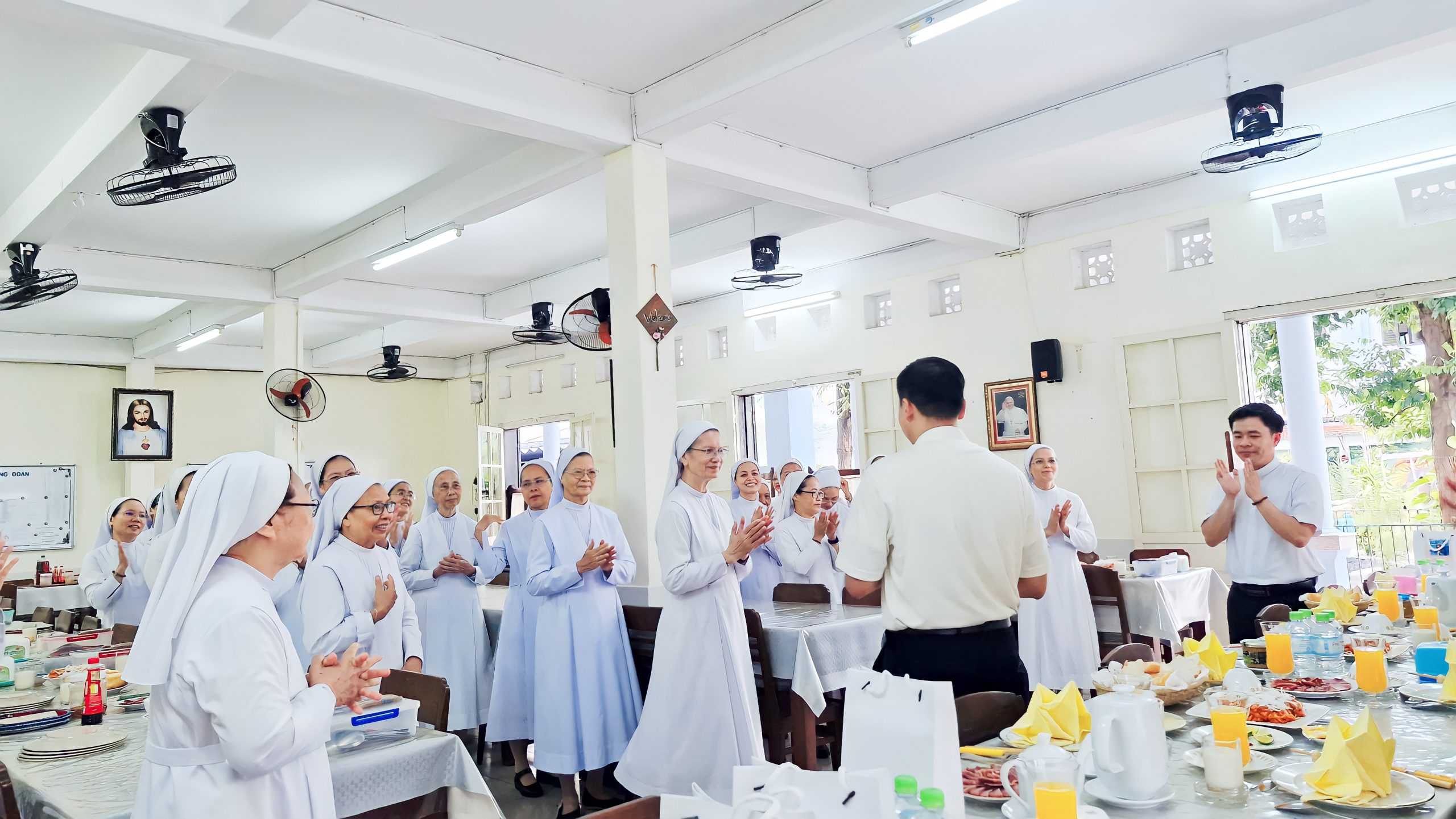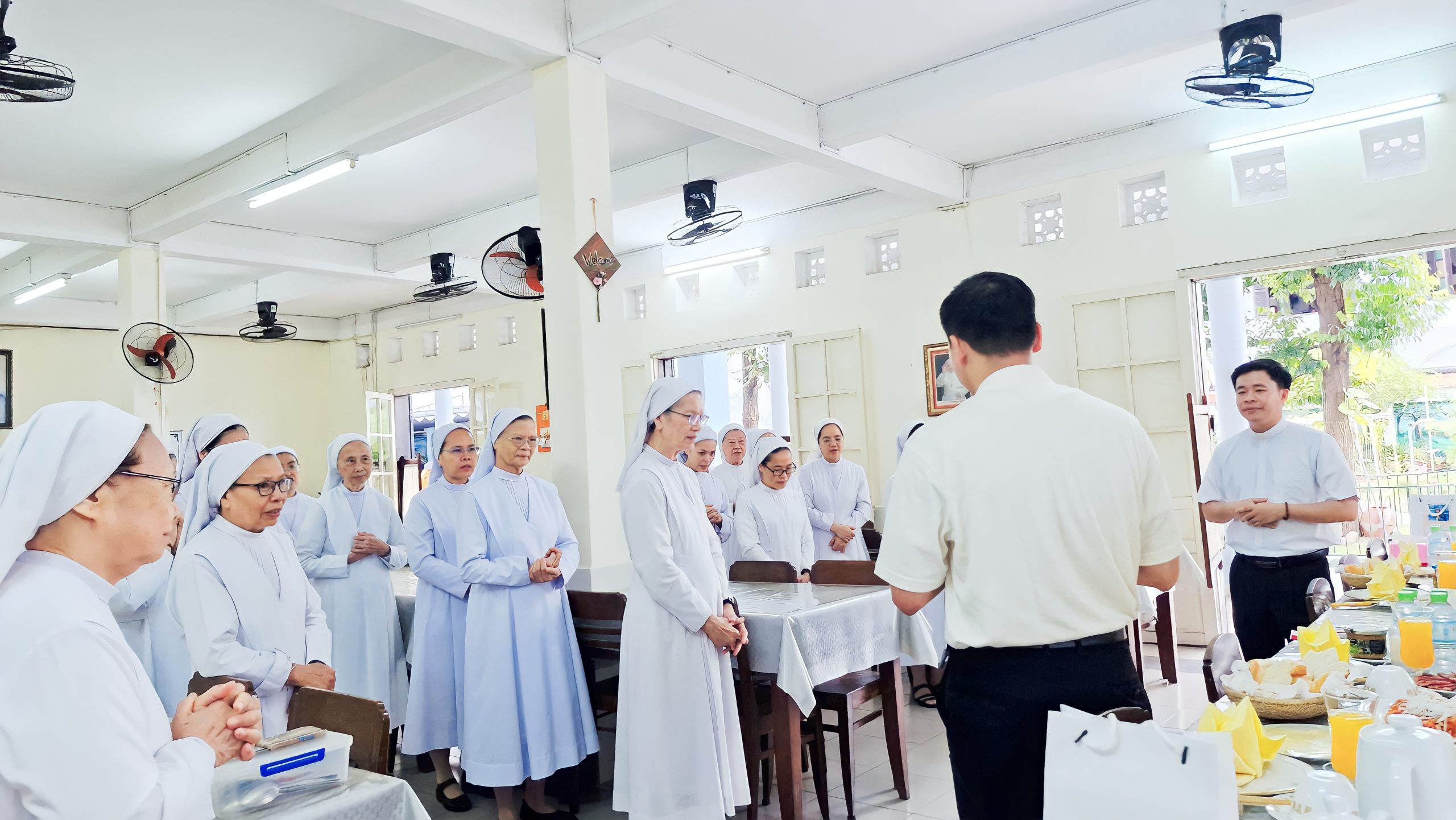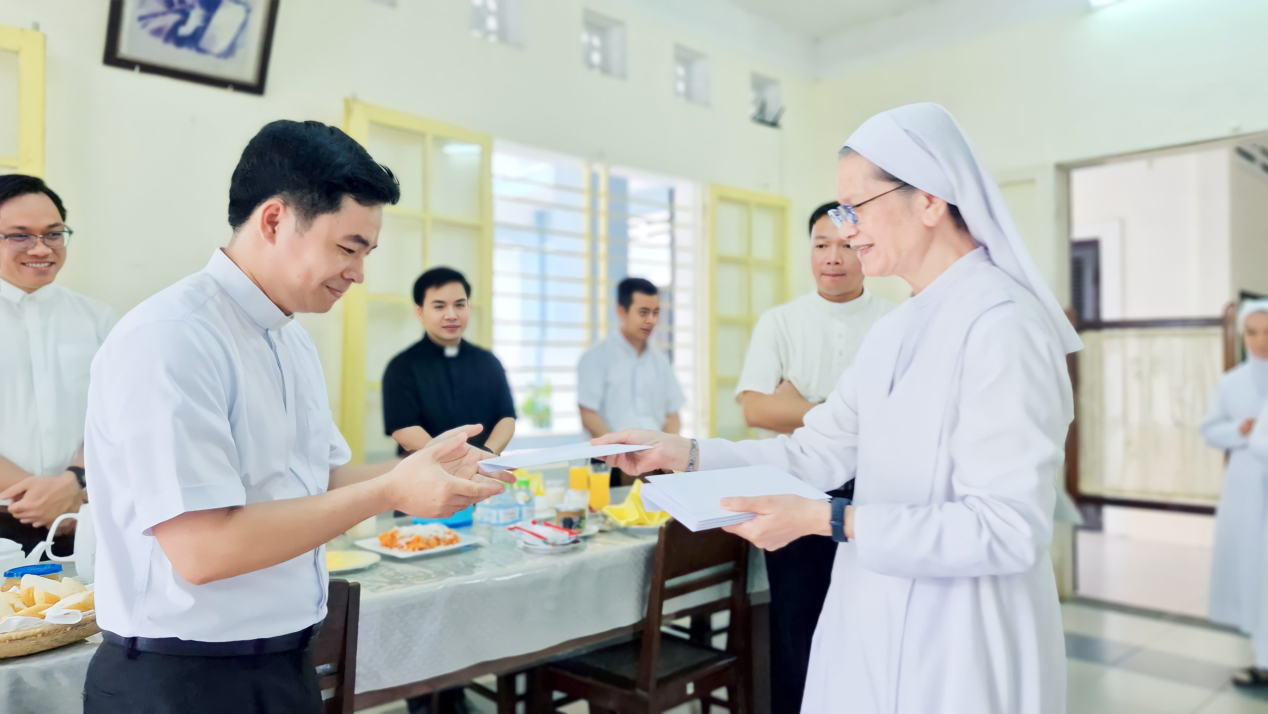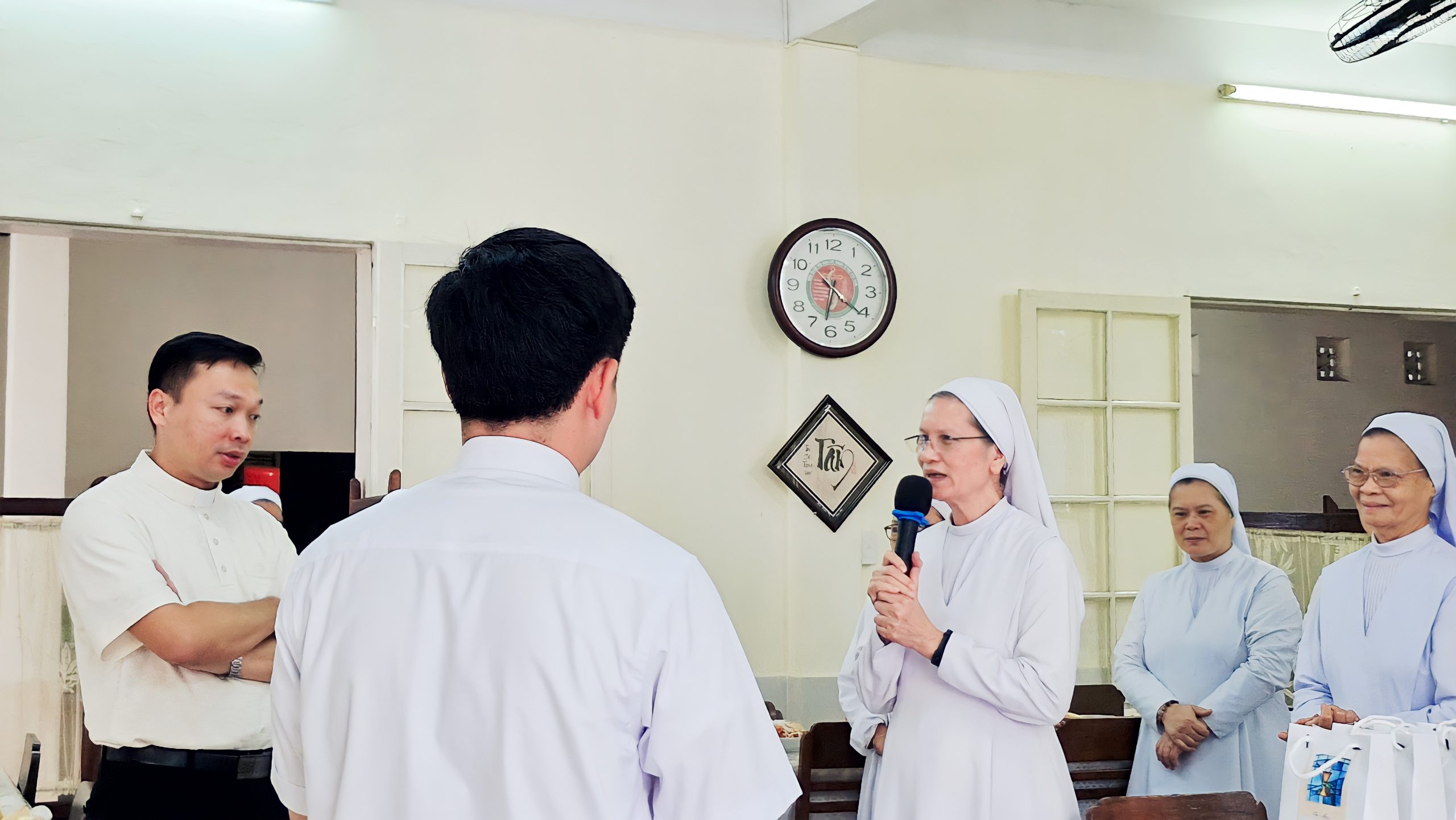 Sau Thánh Lễ, Soeur Bề Trên Giám Tỉnh đã đại diện cộng đoàn gửi lời chúc mừng thân tình đến quý Tân Linh Mục. Niềm vui được tiếp nối trong bữa cơm huynh đệ, nơi mọi người cùng chia sẻ tình hiệp thông, tình thân ái và những lời cầu chúc tốt đẹp cho sứ vụ tương lai của các Tân Linh Mục.
