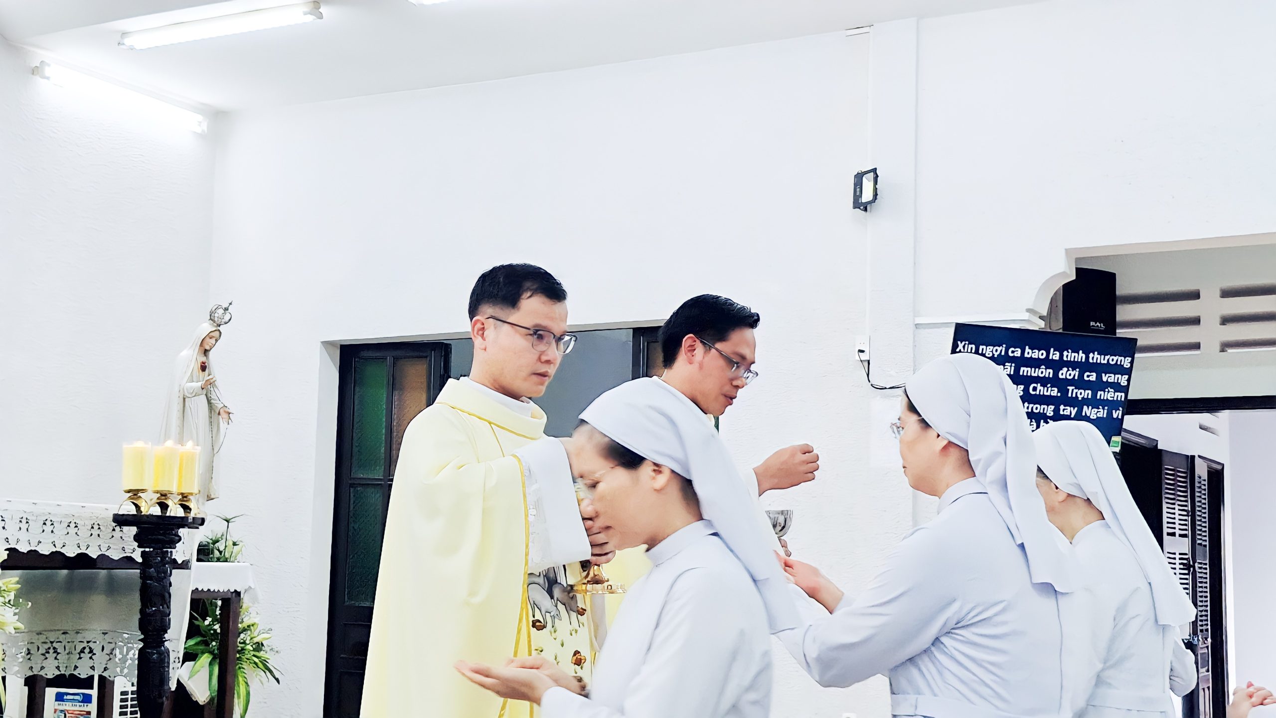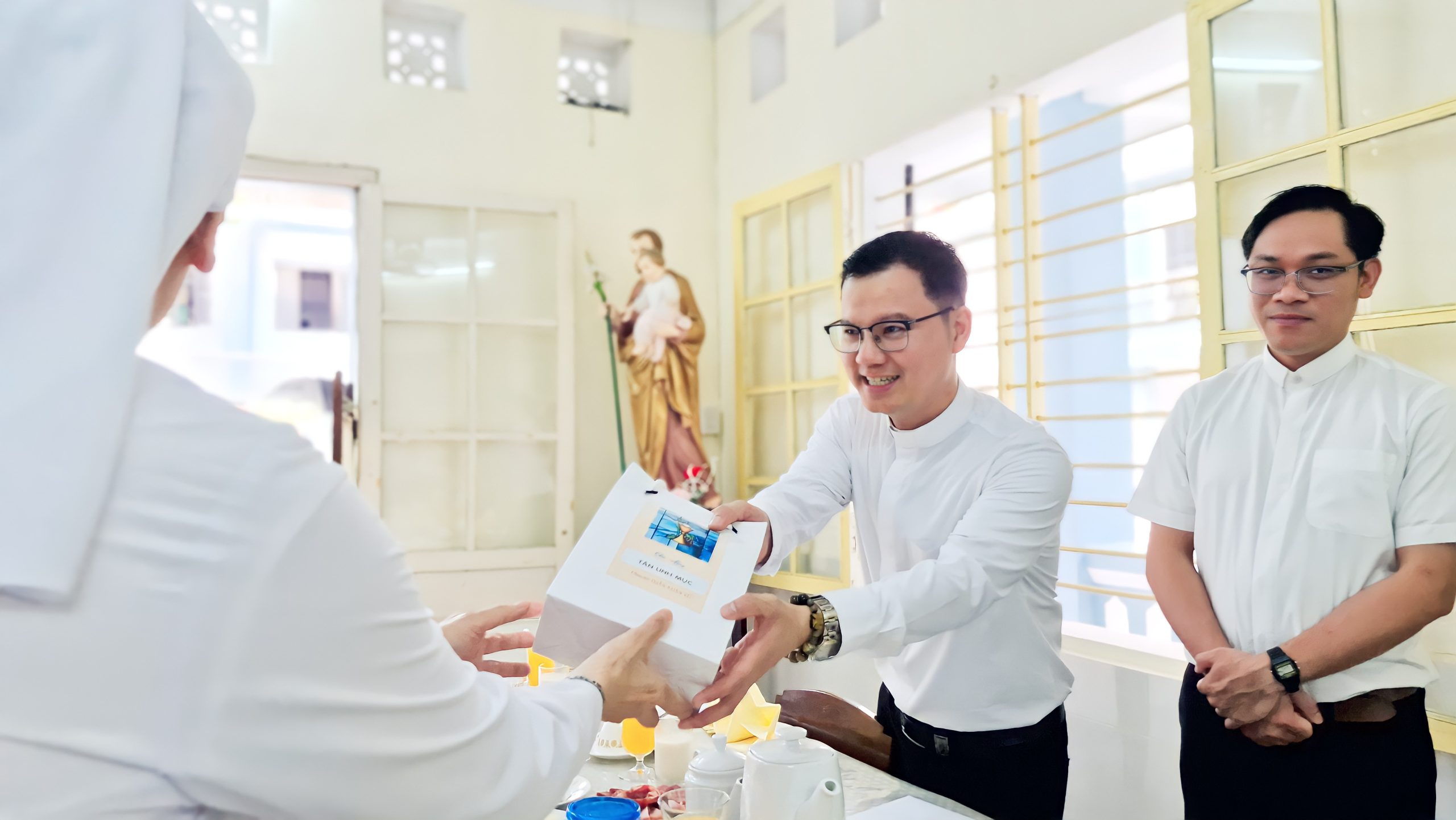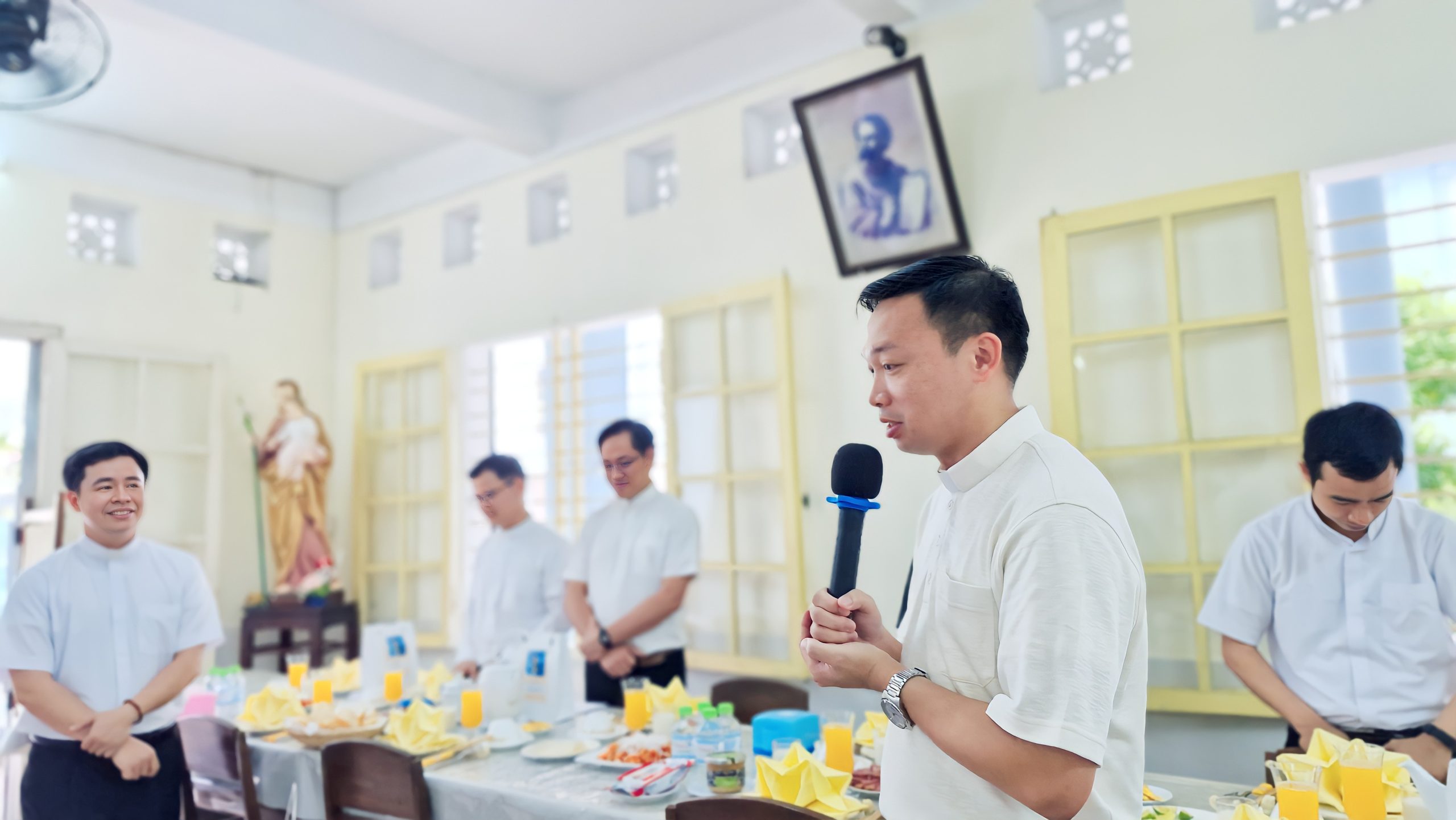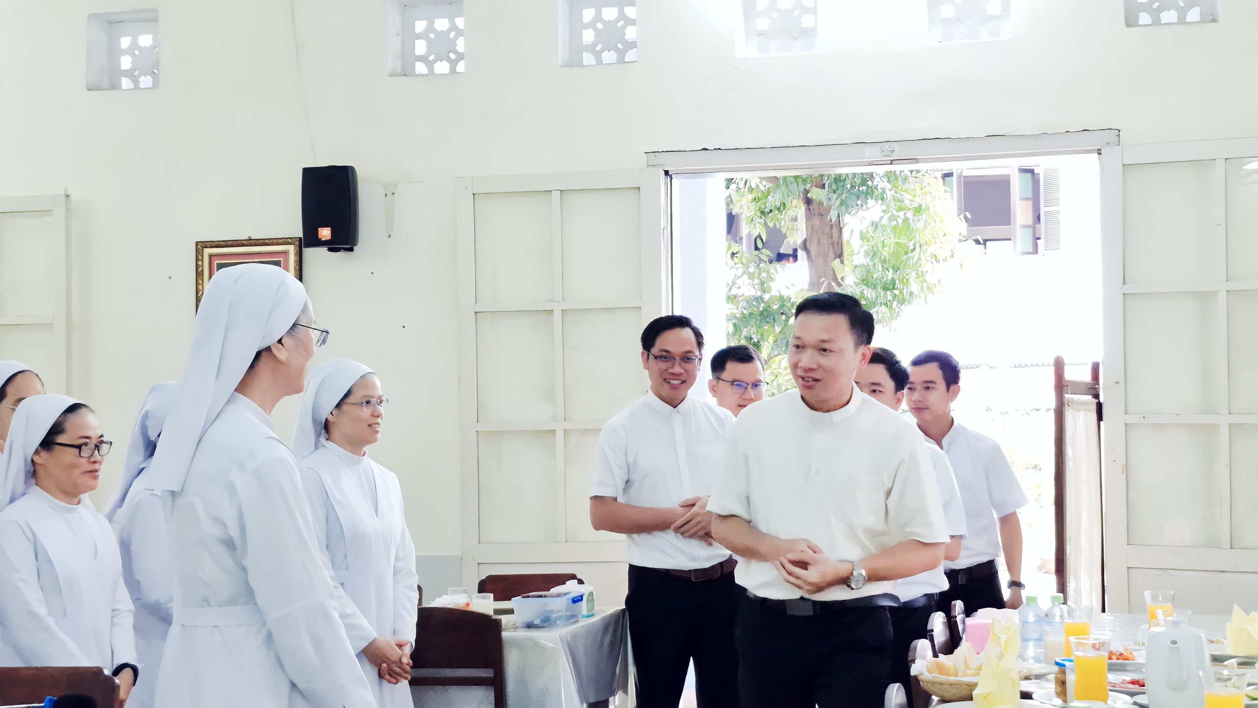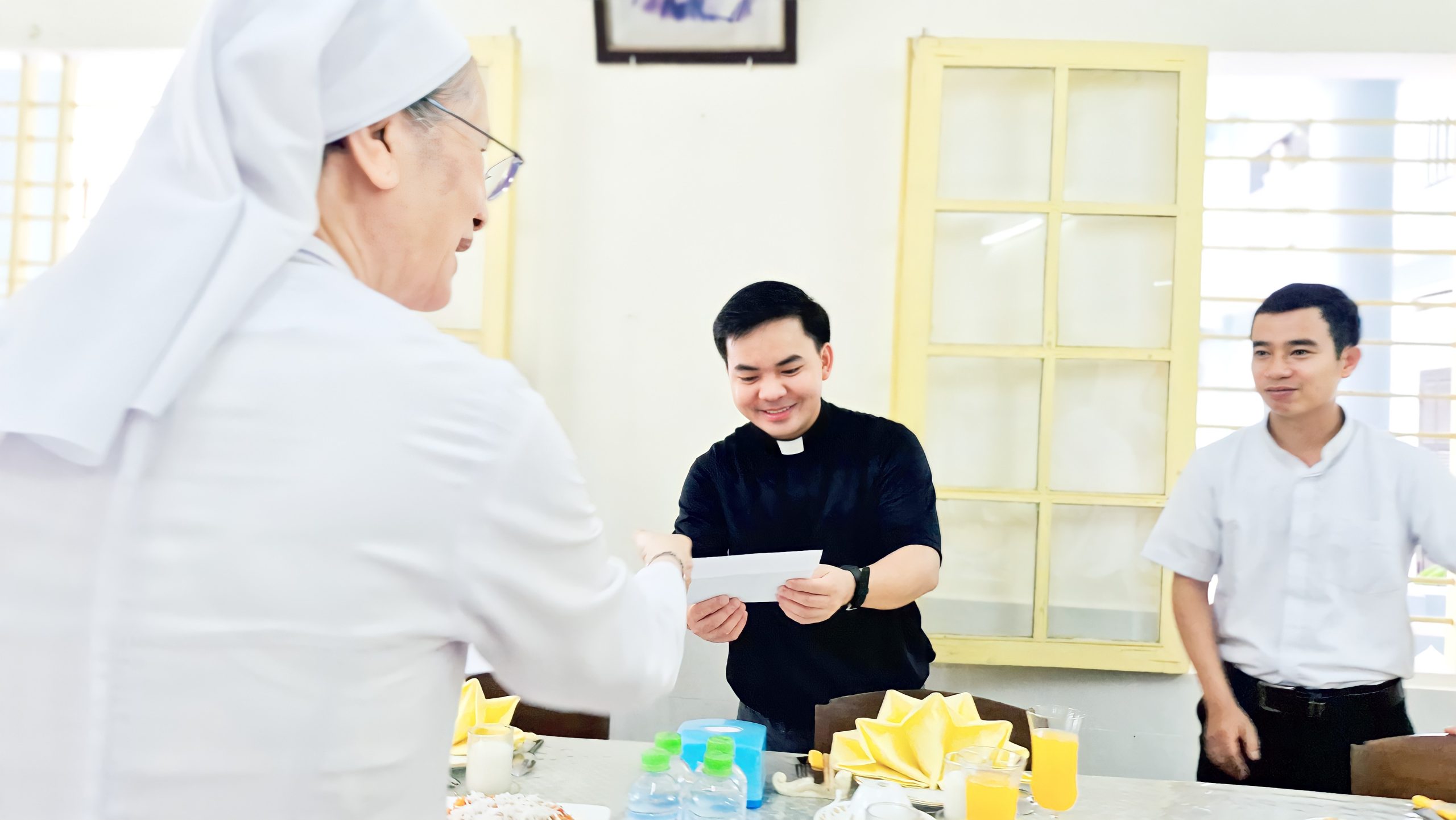 Sau Thánh Lễ, Soeur Bề Trên Giám Tỉnh đã đại diện cộng đoàn gửi lời chúc mừng thân tình đến quý Tân Linh Mục. Niềm vui được tiếp nối trong bữa cơm huynh đệ, nơi mọi người cùng chia sẻ tình hiệp thông, tình thân ái và những lời cầu chúc tốt đẹp cho sứ vụ tương lai của các Tân Linh Mục.