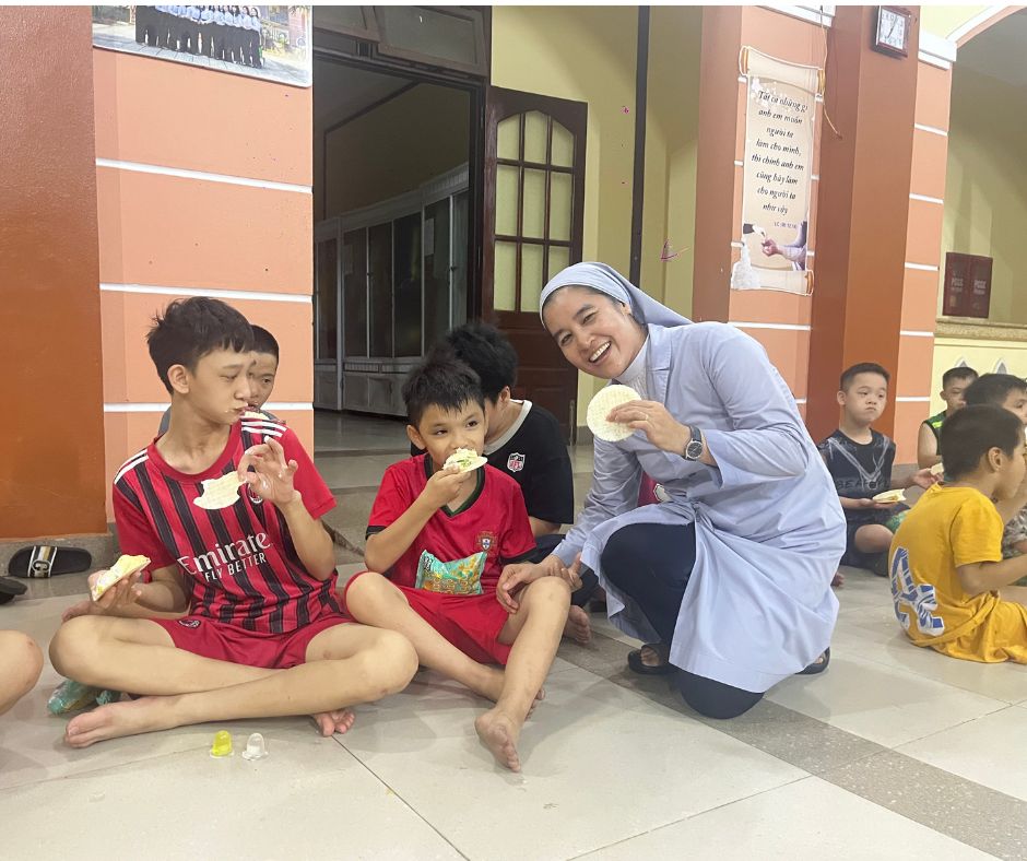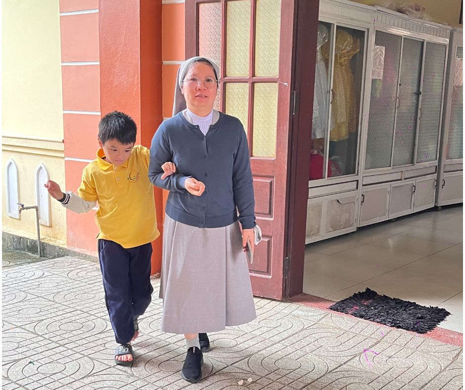 Trong đời sống hằng ngày, chúng em cố gắng phục vụ các em bằng những việc thật bé nhỏ: đút từng muỗng cơm, tập cho các em phát âm từng tiếng, nâng đỡ từng bước đi, nắm lấy bàn tay của em đang khép mình, hay kéo lại tấm chăn cho em khỏi lạnh. Qua đó, chúng em muốn nói với từng em: “Con được yêu thương. Con có giá trị. Chúa đang ở cùng con.”